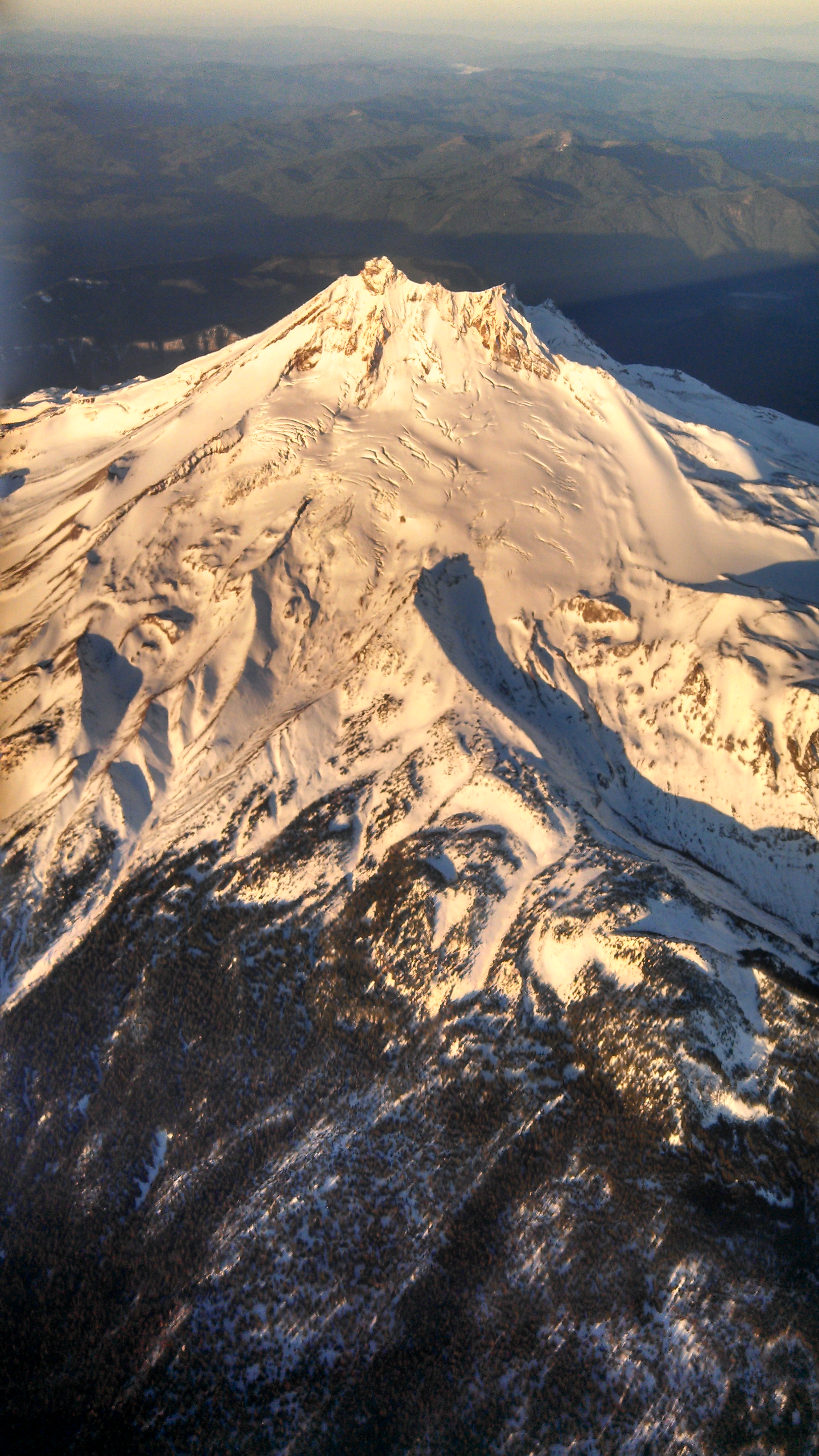 Files attached are some of the mountains in the area that I call home. The Nine Peaks in the region are: Mt, Hood, Mt. Jefferson, Three Finger Jack, Mt. Washington, North Sister, Middle Sister, South Sister, Broken Top, and Mt. Bachelor. In the first picture attached are the Three Sisters and Broken Top from the air. Second picture is Mt. Jefferson from the air. Third is Mt. Bachelor from the air. Fourth is Mt Bachelor with Bend in the foreground. Know you'll be able to find more images on line if you so desire... like this one for Mt. Hood: http://en.wikipedia.org/wiki/Mount_Hood