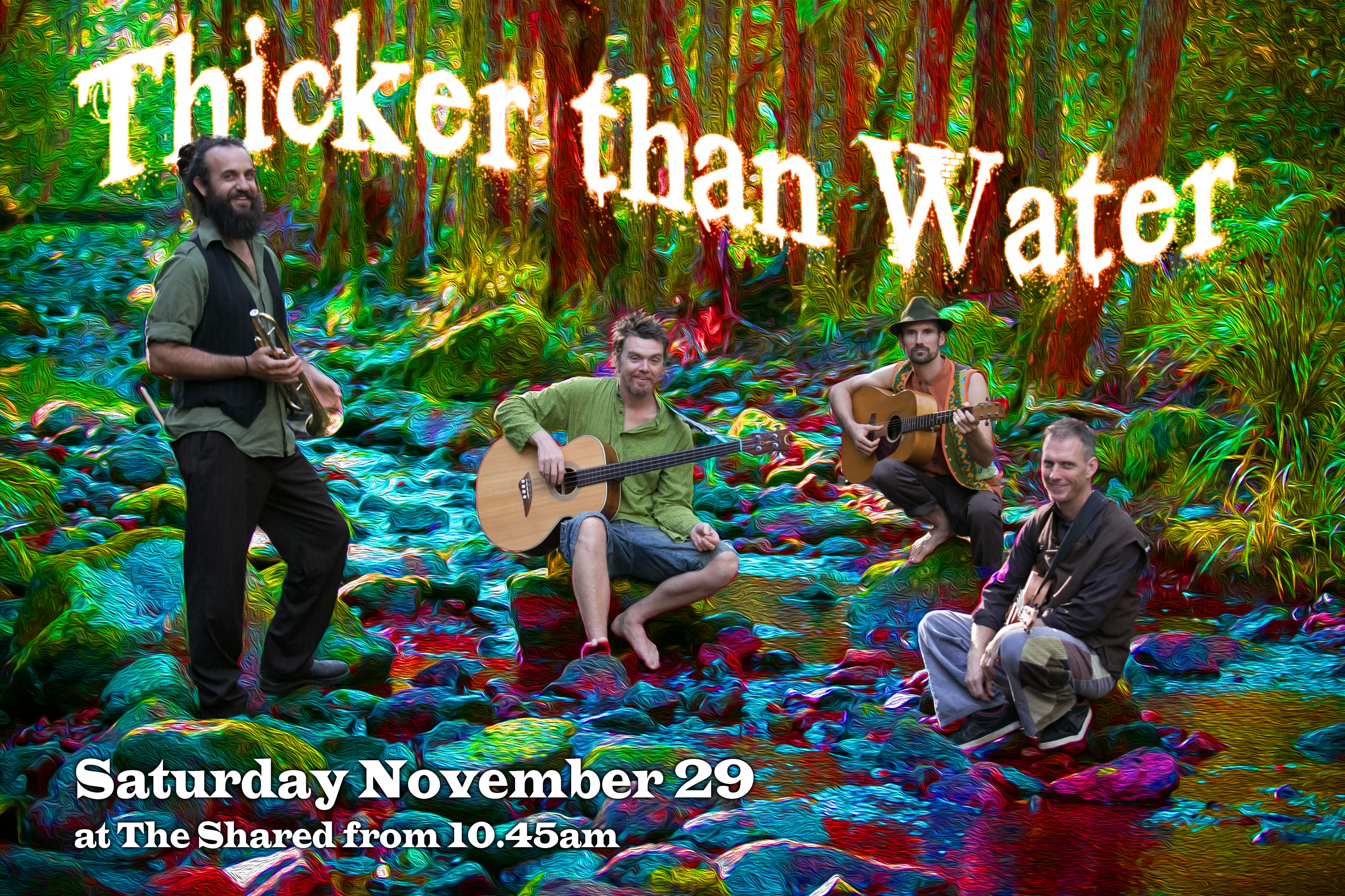 Sunshine Coast based Thicker than Water are a band comprised of multi-instrumentalists John Fredericks (drum, vox, horns, guit, keys), Michael Cheetham (vox, guit, bass), Rufus Lane (bass, vox, guit) and Ben Lockens (guit, drums, vox, keys, didjeridoo).