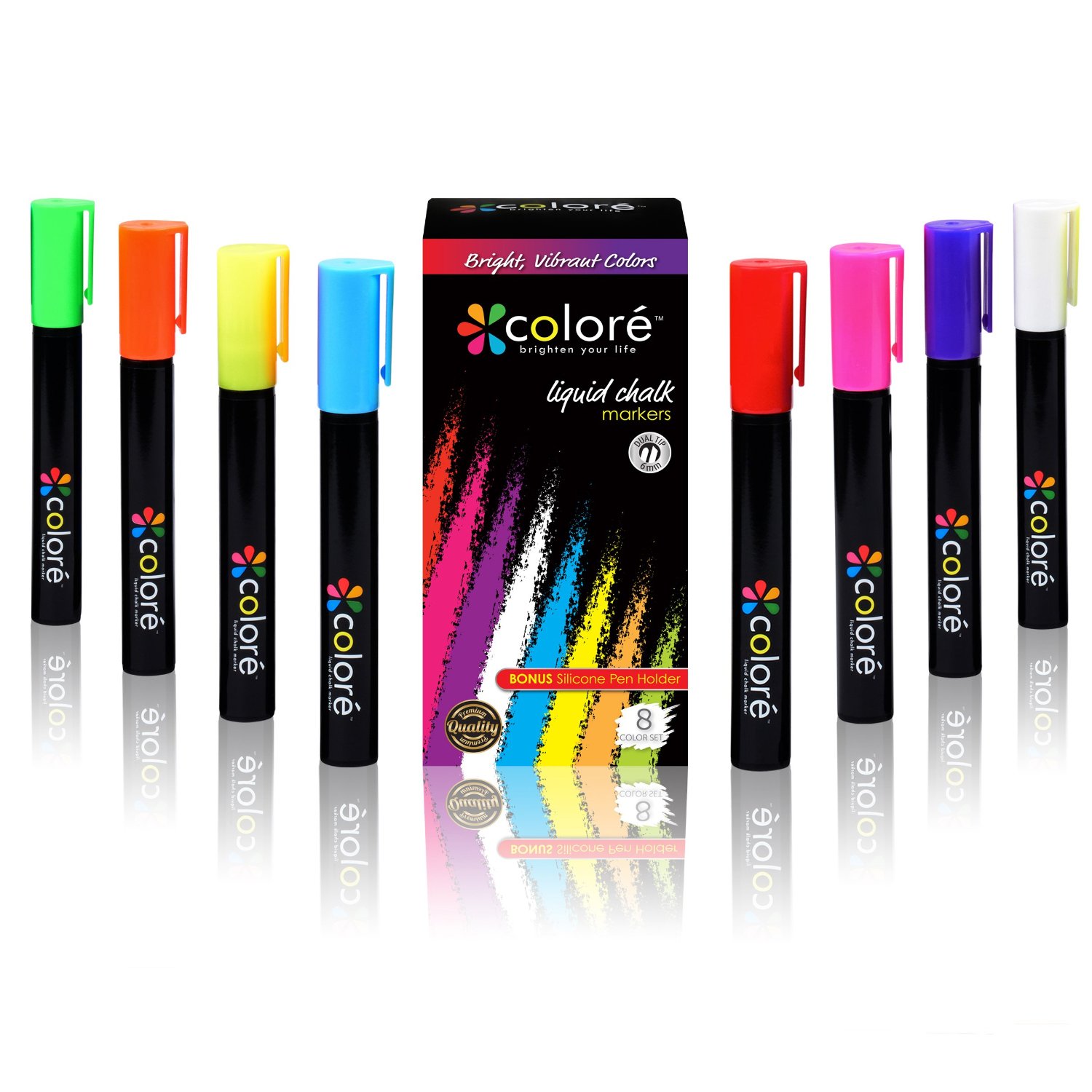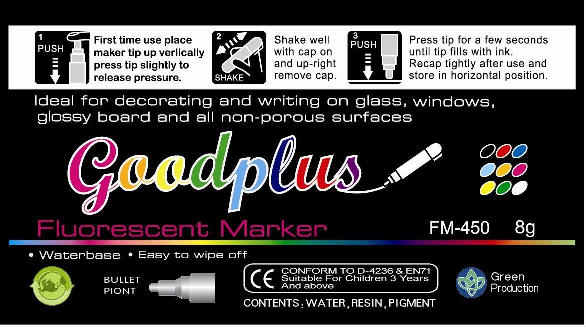 We need a packaging design and sticker label for a new brand of markers called "GIMS Chalk", consisting of 8 liquid chalk fluorescent markers to be used in non-porous surfaces. Attached is file with the description of contents to be included in it. Preferred colors: black, navy.