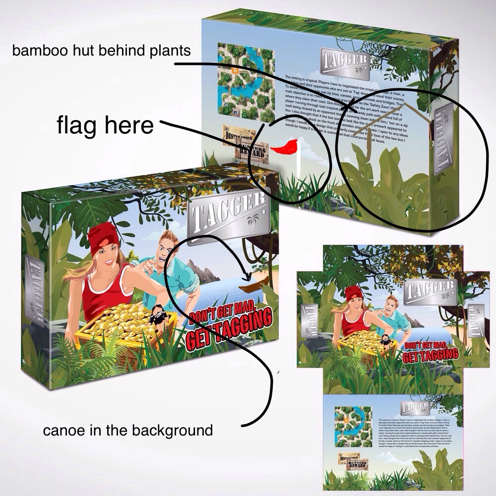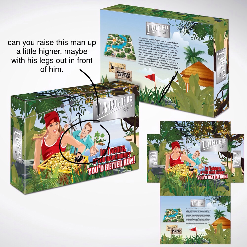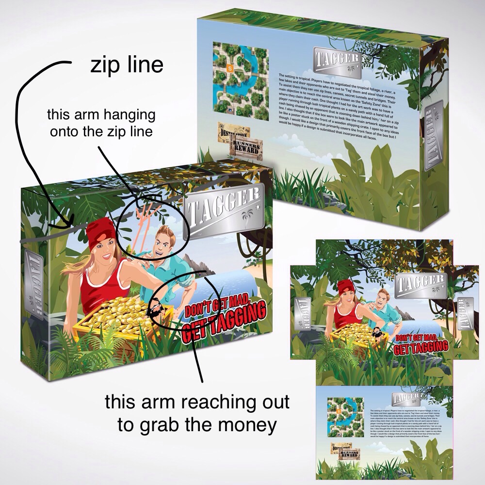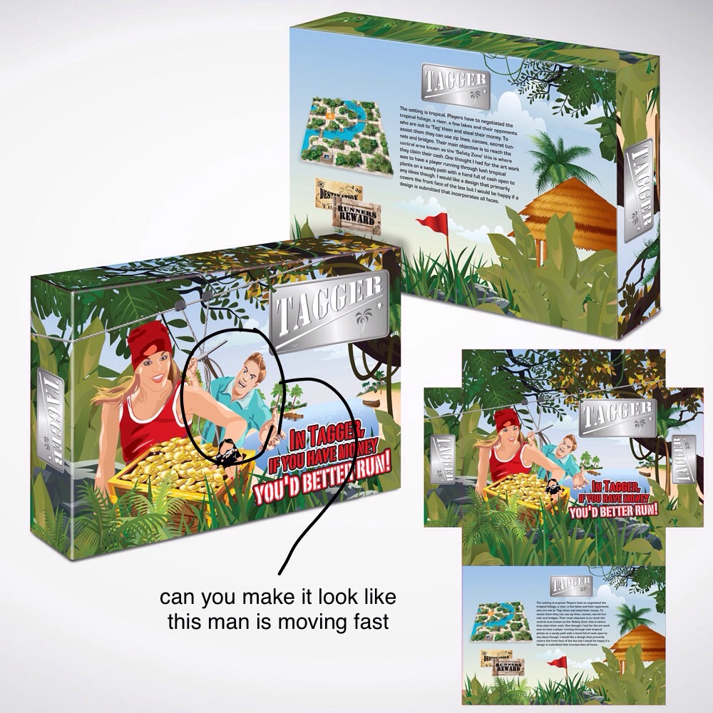 I'm looking for a box cover design for a board game named 'Tagger'. I have already produced a logo for the game which is based on a stylised dog tag with an embossed 'Tagger' logo written on it. What I am looking for is a cover that conveys the feel of a fast paced, modern game where players are on the hunt to grab as much money as they can or to be precise, more than their opponents. The setting is tropical. Players have to negotiated the tropical foliage, a river, a few lakes and their opponents who are out to 'Tag' them and steal their money. To assist them they can use zip lines, canoes, secret tunnels and bridges. Their main objective is to reach the central area known as the 'Safety Zone' this is where they claim their cash. One thought I had for the art work was to have a player running through lush tropical plants on a sandy path with a hand full of cash being chased by an opponent that is zooming down behind him/ her on a zip line. I also thought that if the box were to look like the main artwork appeared to be like a poster stuck on the front of a wooden shipping crate. I open to any ideas though. I would like a design that primarily covers the front face of the box but I would be happy if a design is submitted that incorporates all faces. I think that Earthy colours would suit and a slightly weather beaten look about the whole box as though it had washed up on a beach.