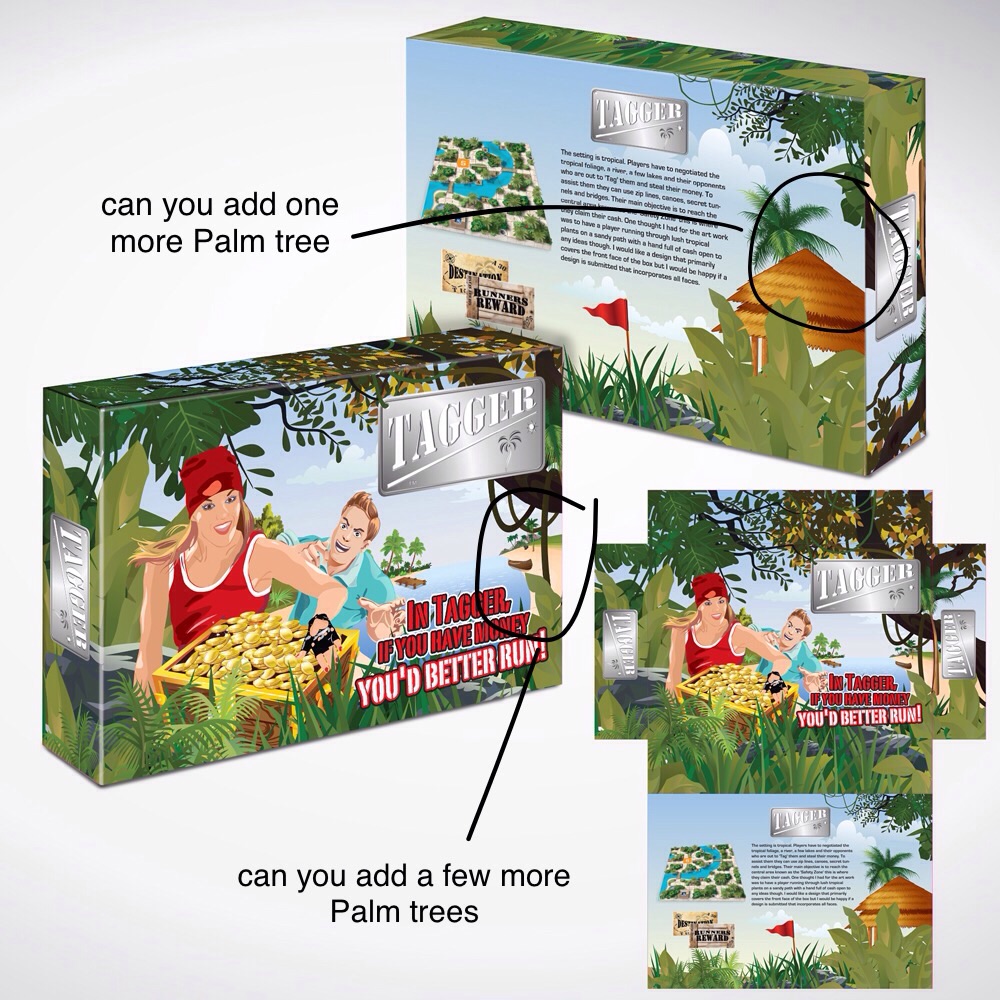 - I want the look of the box to project an exciting, fun filled, competetive gaming experience all set on a sunny tropical island. The setting of the game is tropical and I would like to include all of the following, lush topical plants, Palm trees, sandy paths, bamboo huts and zip lines. I would like two or more people (contestants) to feature on the front box, they need to look like they are in competition against each other but having fun doing it. I would like them dressed in modern casual beach/street wear. I want at least one of them to be female. I want a design that grabs people's attention and can give an insight into what the game is about and makes them excited about playing Tagger.