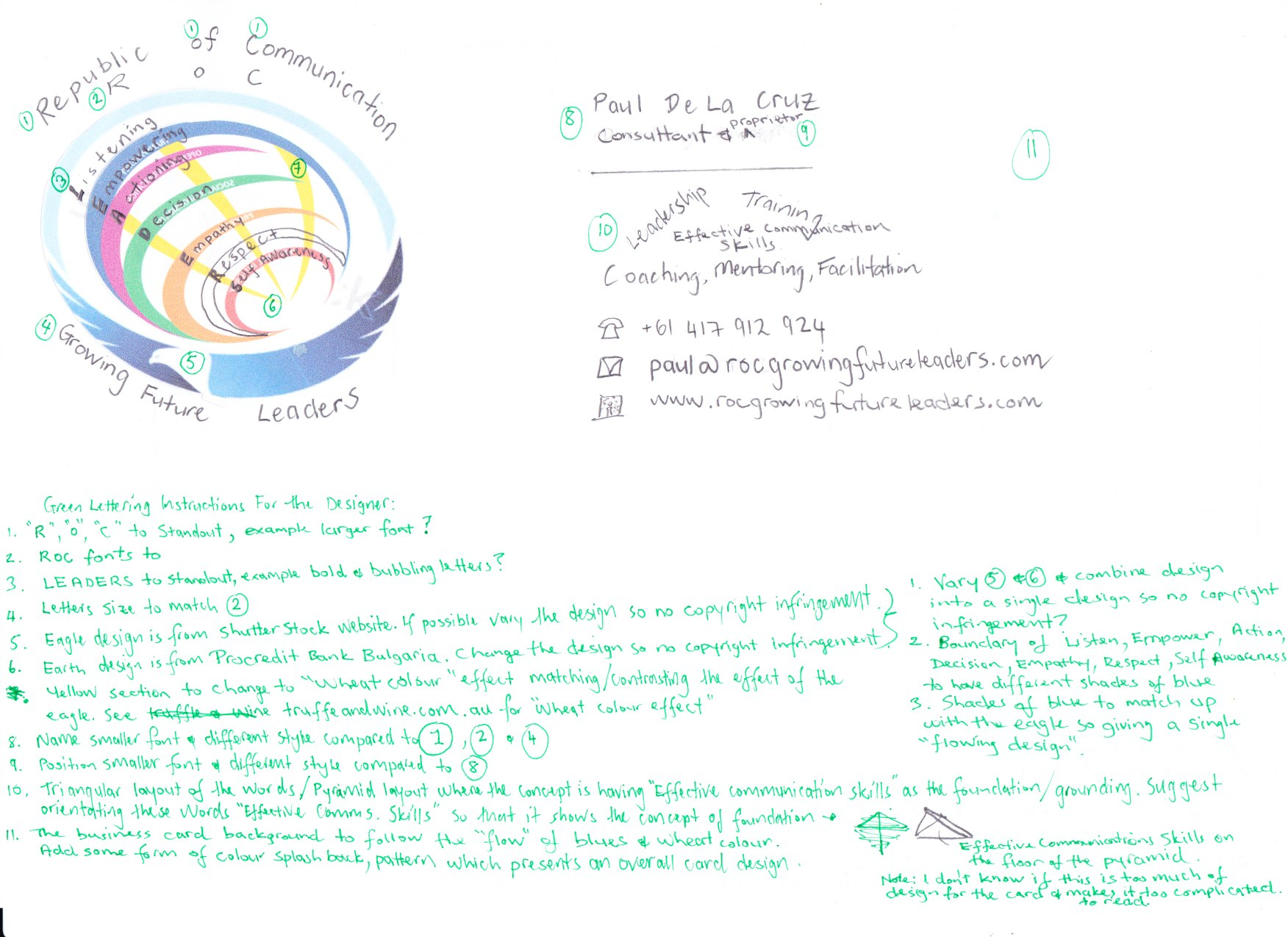 For the services Coaching, Mentoring, Facilitation, Leadership, Training, Effective Communication Skills. I would like the words arranged in a "simple and elegant 3D configuration". Using Effective Communication Skills as the base of the layout. See attached for examples of 3D. The Main Logo of the Eagle and Earth is the centre piece.