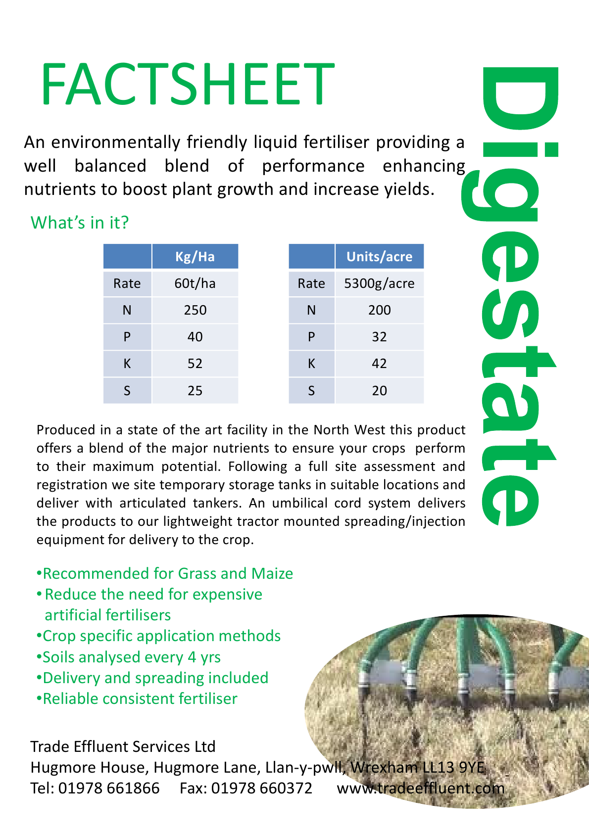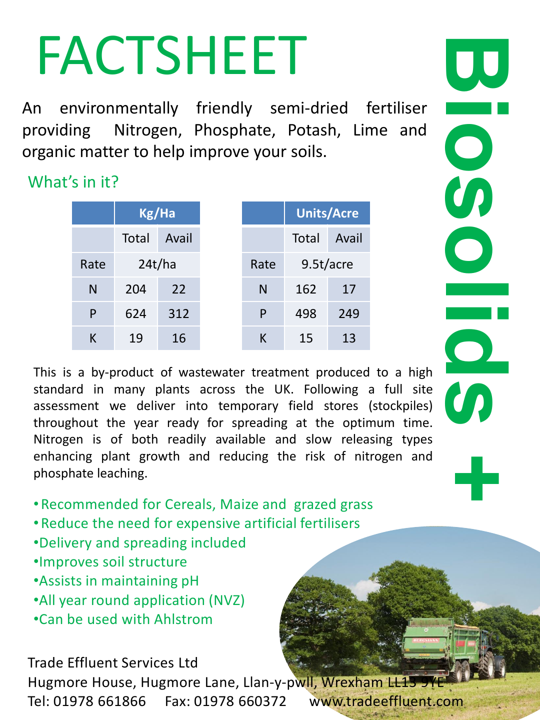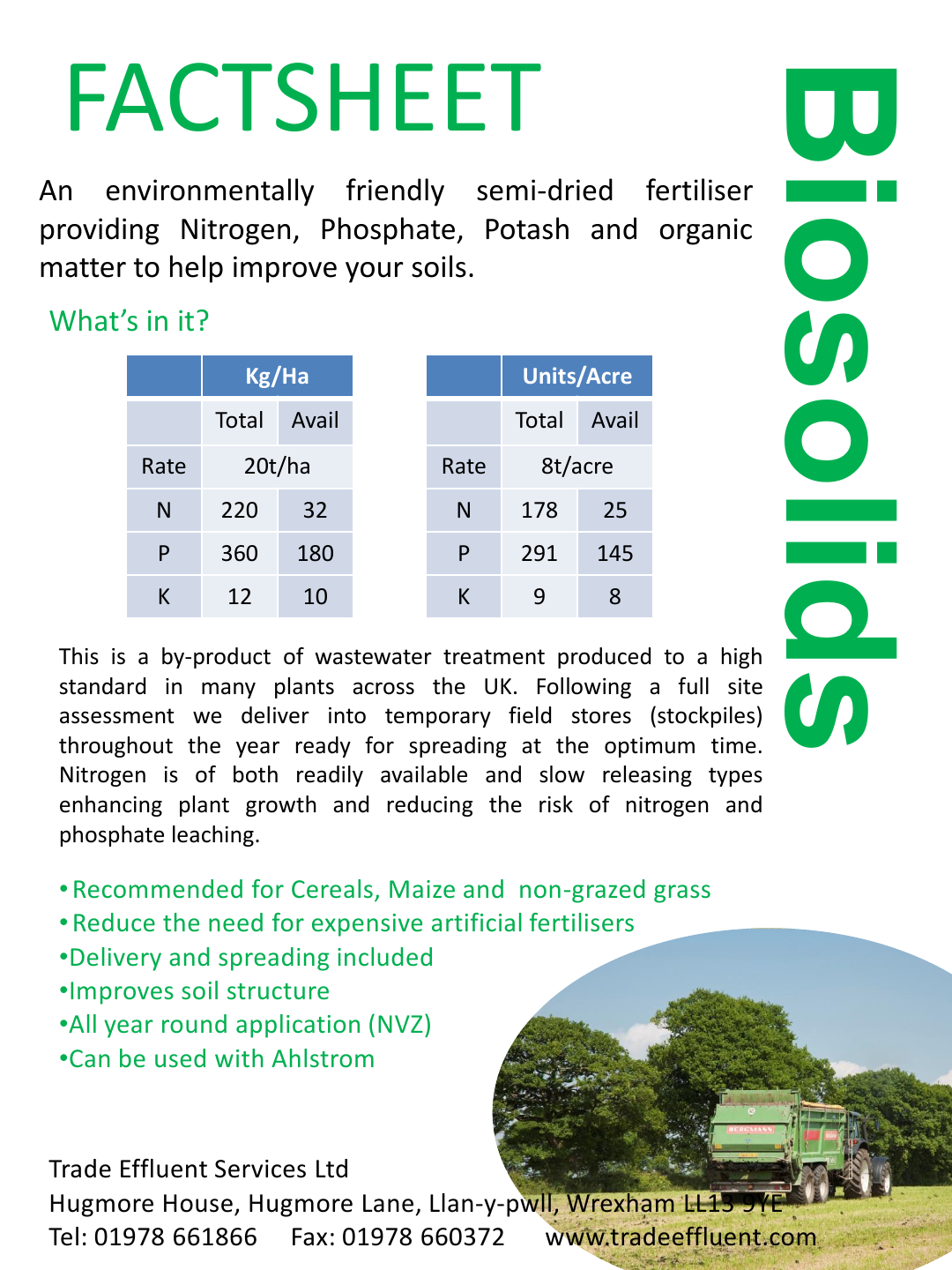 We are a waste management company that specialises in recycling products to farm land as an alternative to checmical fertilisers. Having just launched a new brand, we are looking to update our product factsheets which are sent out or given to farmers. Using our products can help significantly reduce or eliminate farmers chemical fertiliser costs and our services also provide additional benefits (soil analysis every 4 years, consistent pricing, no spreading costs (to farmers))