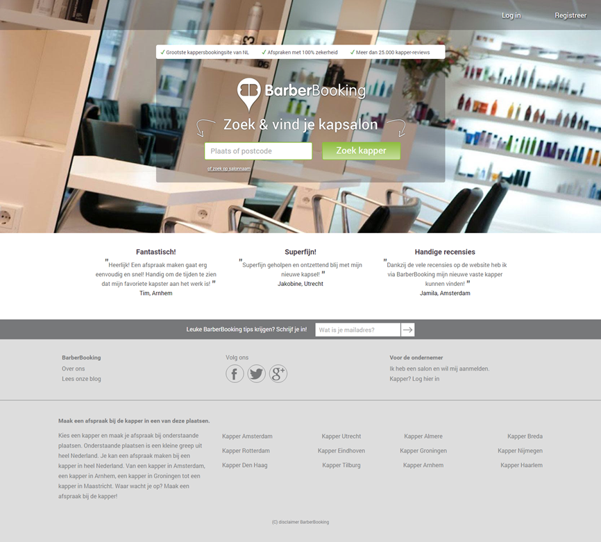 - We need a homepage (https://barberbooking.com/), search resultpage ((https://barberbooking.com/kapper/amsterdam/#), salonpage (https://barberbooking.com/kapper/vorden/da-vinci-for-hair/), about us page (https://barberbooking.com/aboutus/), for the hairdresser info page (https://barberbooking.com/kapper/), login/register page (https://barberbooking.com/account/signin/).