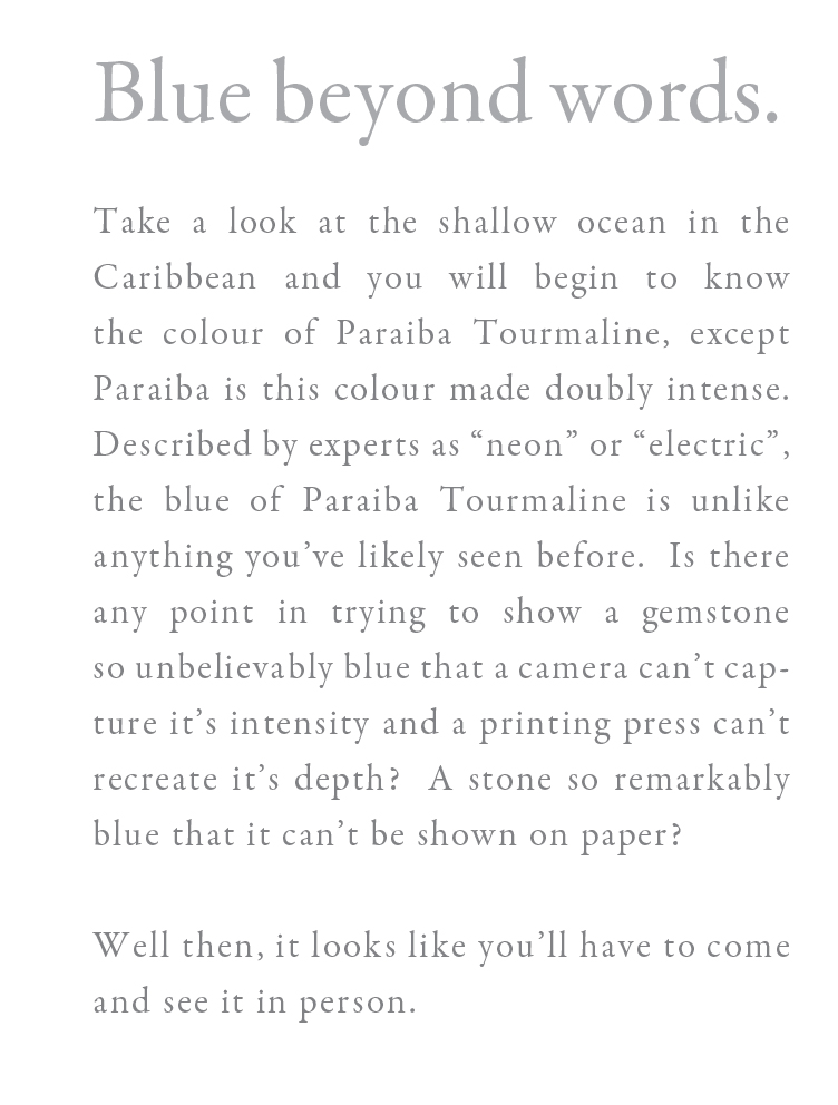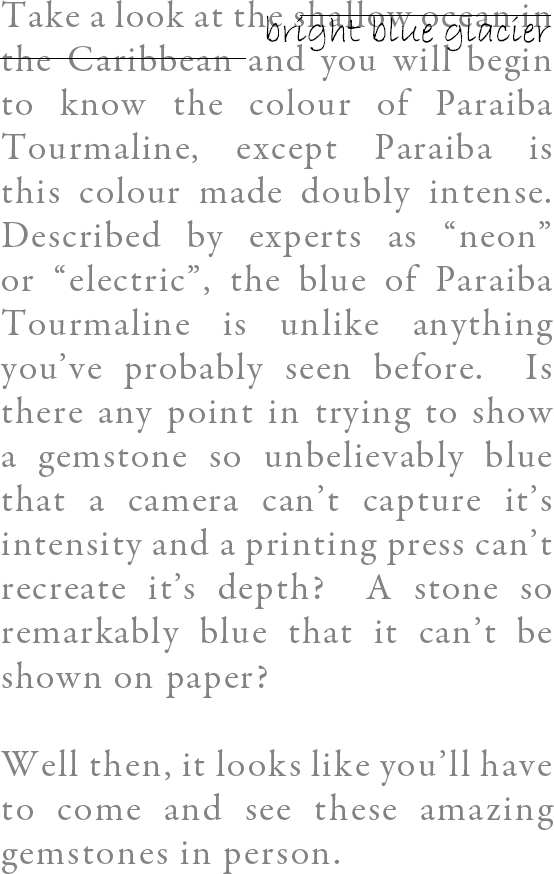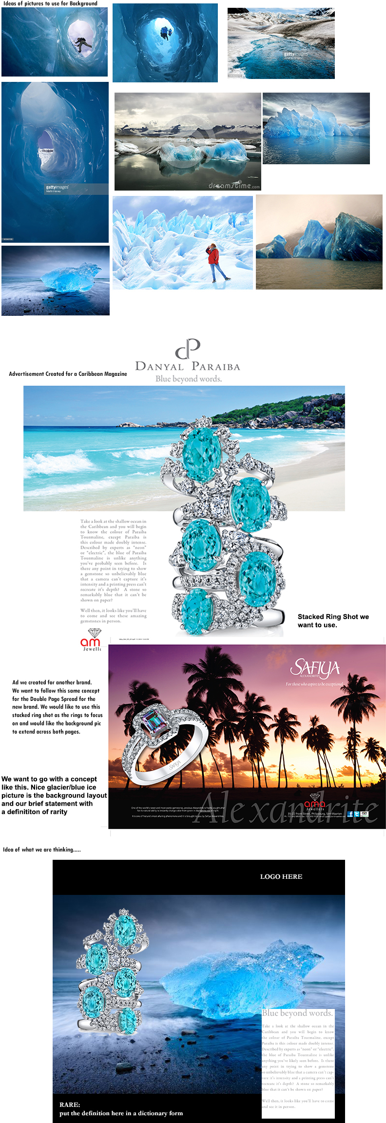 We are a new company trying to promote a new and exciting gemstone to the retail world. We started a new brand and now need to create a pristine, clean image that will help it sell. We have created a theme for the Caribbean cruises, but now we need to create a theme for the Alaskan cruises. I have attached a page of thoughts and examples that we would like to follow. We want to create the thought (through the image) that this stone is really rare and exquisite. We want to sell the color of the stone, because the color is like no other. The tagline we use is "BLUE BEYOND WORDS."