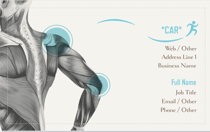 - Colour scheme should be green, black, and steel/charcoal grey. The business focuses on massage as an anatomical solution to stress, muscle aches, pains and fatigue. Ideally we'd like an anatomical image of the muscle system (ref to the attached files). In my mind this image takes up most of the left third of the card, and shows points of tension and pain at the neck and lower back. This image should be the grey portion of the card.