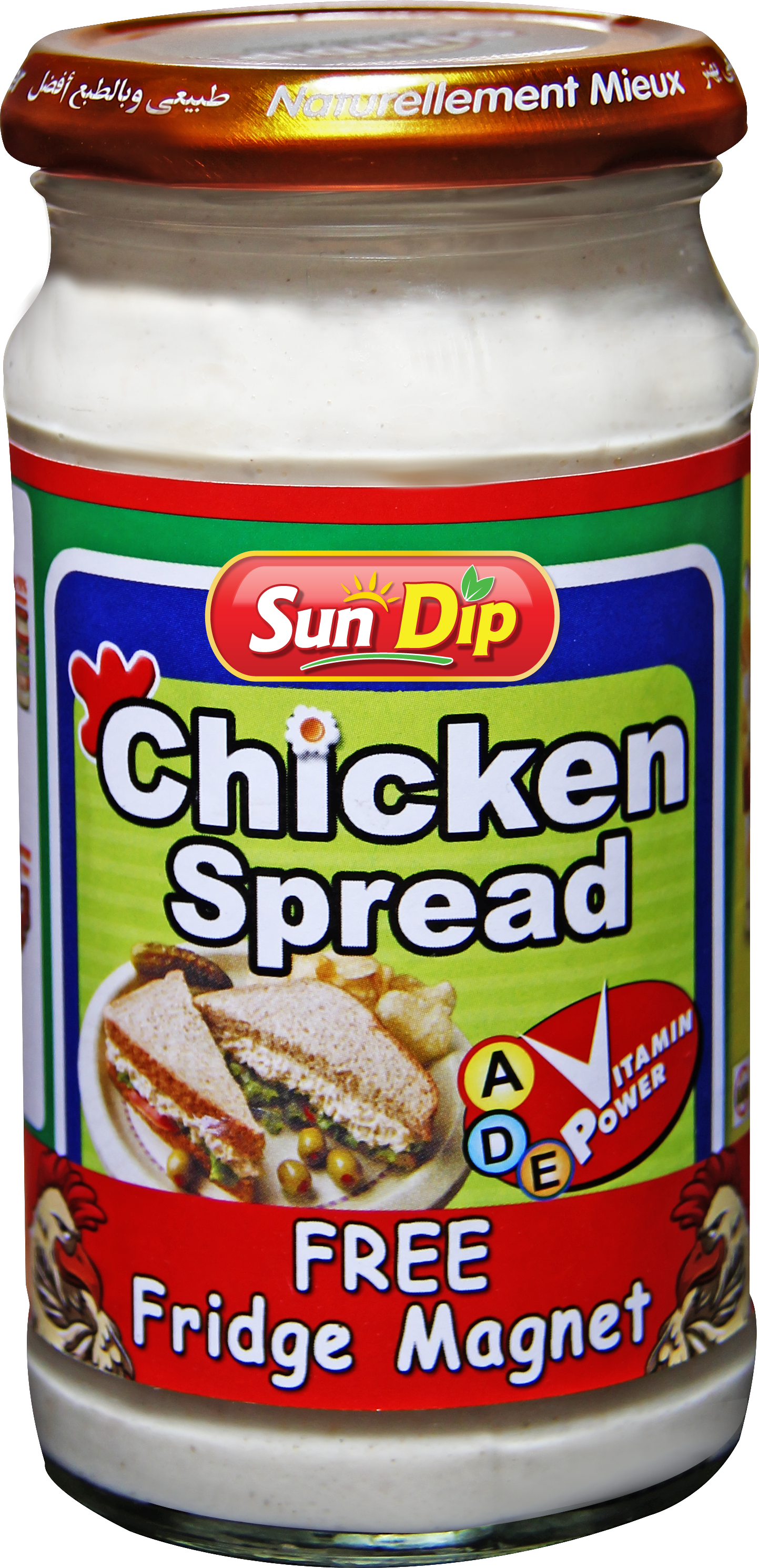 the product is a mixture of boiled chicken meat cut in shreds, mixed with mayonnaise. ideal for snacks time, just spread on a toast/bread/bun and you have a chicken sandwich ready.