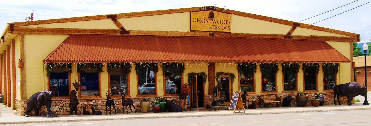 Ghostwood Interiors is a One-of-a-kind Rustic, mountain, Barnwood furniture store in the ranching community of Kremmling Colorado. We custom design and build furniture from reclaimed wood. We enhance our furniture with slate and patina copper. Our wood shop and showroom are all on one 5000 sq ft. site. We offer all kinds of rustic and lodge decore from antler lighting to rugs and accessories. We desire a real western or rustic look. Photos are of the store and our old logo...we want to lose the old logo quick as it really doesnt embrace the western or rustic culture up here in the rocky mountains.