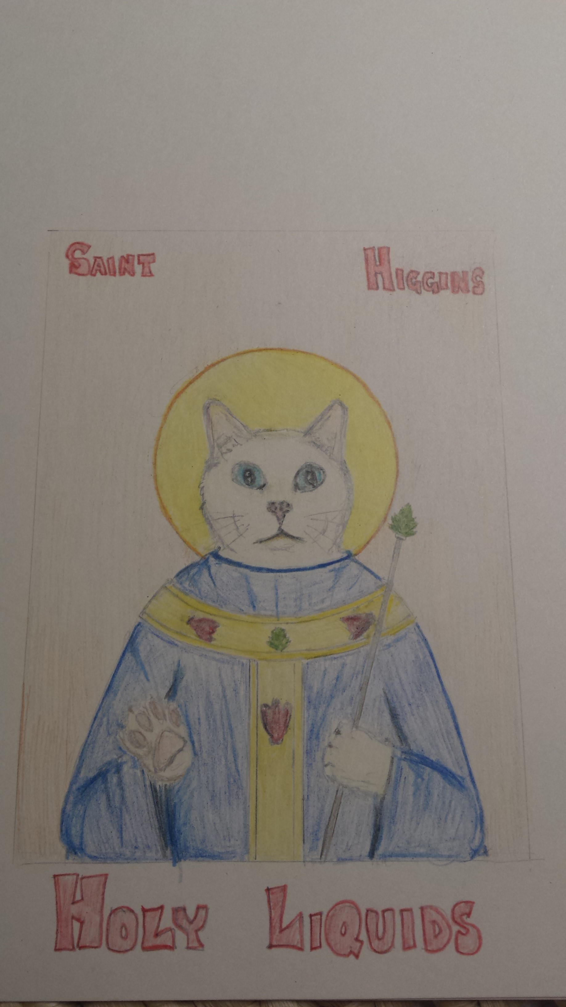 - Higgins is my cat (pictures attached). My image is a design that looks like the old artwork, stained glass windows, etc. of saints.... except that now, it is a cat.