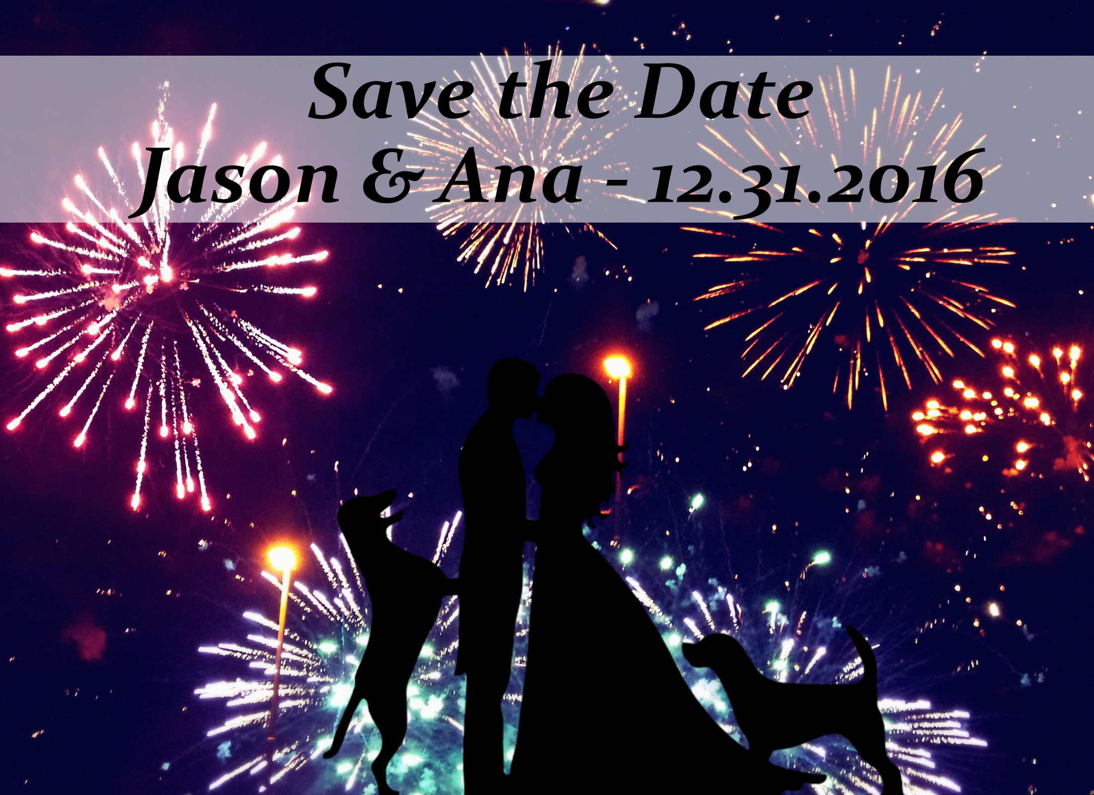 Ana and Jason (we) are getting married 2016-12-31. I'm a hockey player, and she's into movies... we have 2 yellow labs, and we want a Save the Date postcard that matches our personality and the excitement of the event. See attached mock up that I've created (which will be what we fall back on if we can't find a design we like). I like the idea of the silhouette people and dogs under fireworks but am open to other concepts as well. String lights, champagne bottles/flutes, etc...