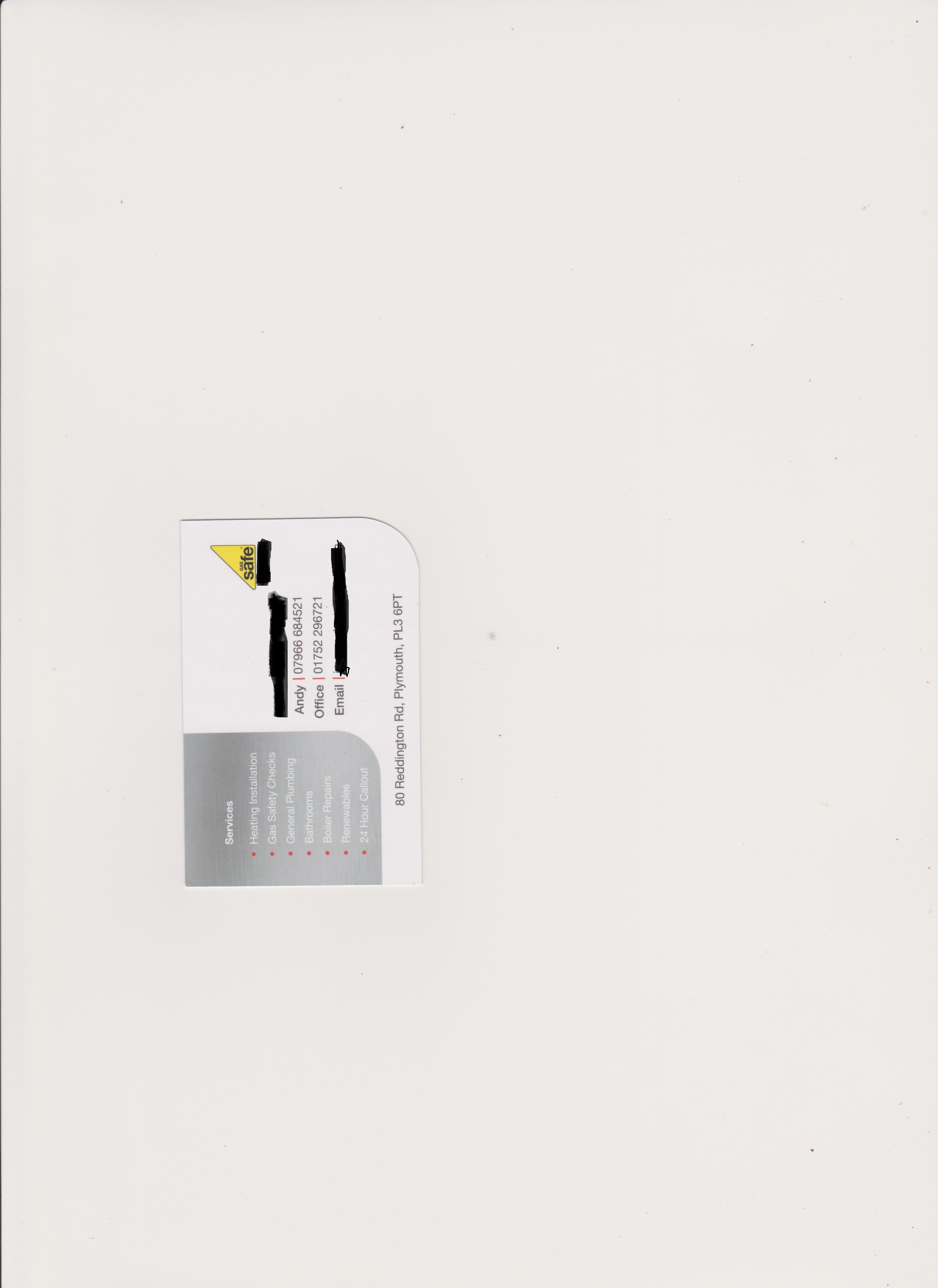 i have put up my old card. not to bothered about the front but i have put up the back for the details. mobile number and office are the same and the email has changed to griffplumber@gmail.com