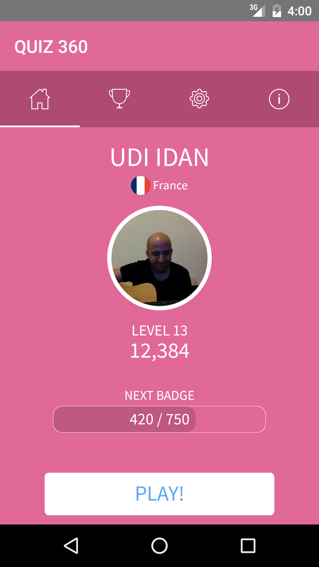The game's name is "TRIVIA 360" - the logo should be modern and flat and match the colors of the game's screens (attached are screen shots of the game).