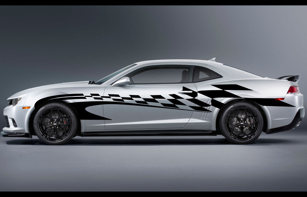 - Incorporate a black and white checkered flag (NOT the flag pole, NO clipart). This can be in overlay, behind, or part of the lettering.. It should look like it is tearing apart at high speed... see the photo of the Camaro as an example.