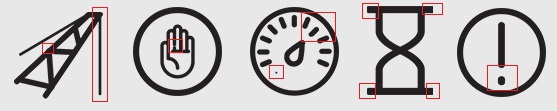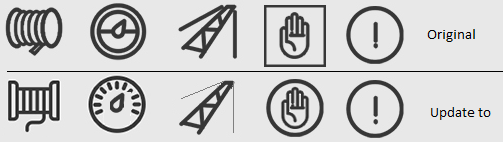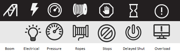 Boom, Brakes, Fire System, Lube System, Electrical System, Air Pressure, Temperature monitoring, Rope System, Emergency stops, Delayed shutdown, System Overloaded. Have attached an example layout and suggestions for each individual icon, Uncertain on design for overload, delayed shutdown and emergency stop icon so open to suggestion.