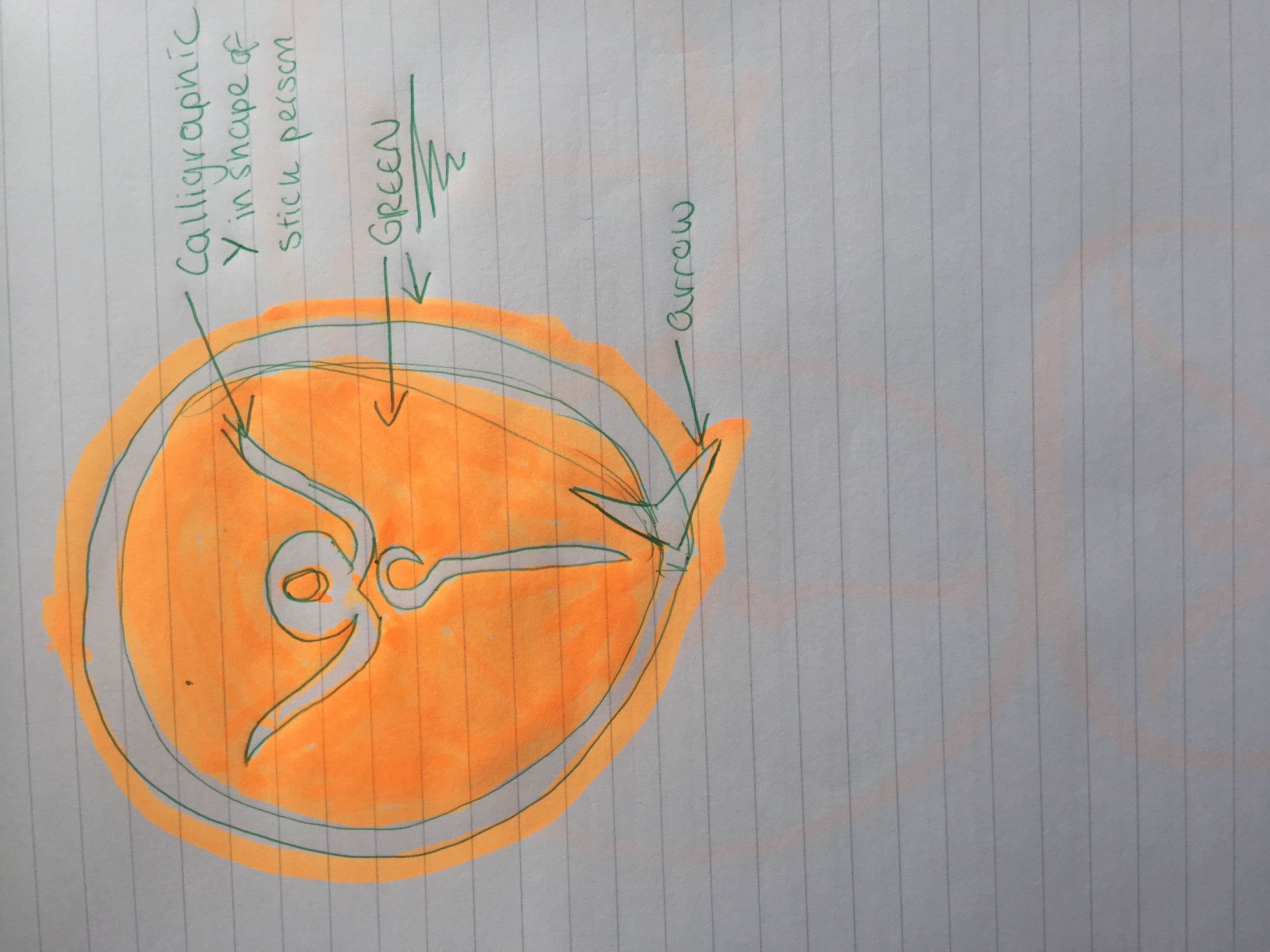 BRIEF UPDATE 12/9/16: Please see most recently attached image of my own drawing. I want the figure to be in a calligraphic style representative of 'Y'. Please note the arrow also.
