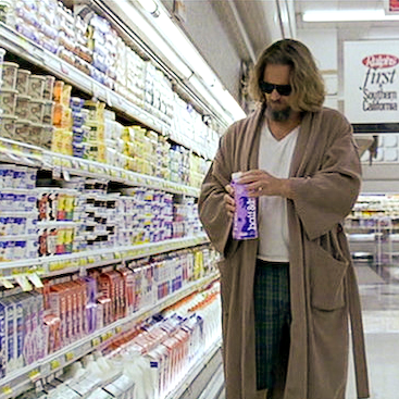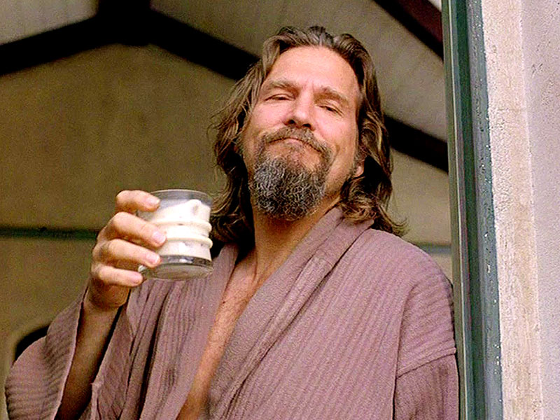 Looking for Bill Clinton in the style of 'The Dude' from the Big Lebowski drinking a white russian. Design should be of Bill Clinton's head on The Dude in either his iconic robe or sweater, with a white russian drink.