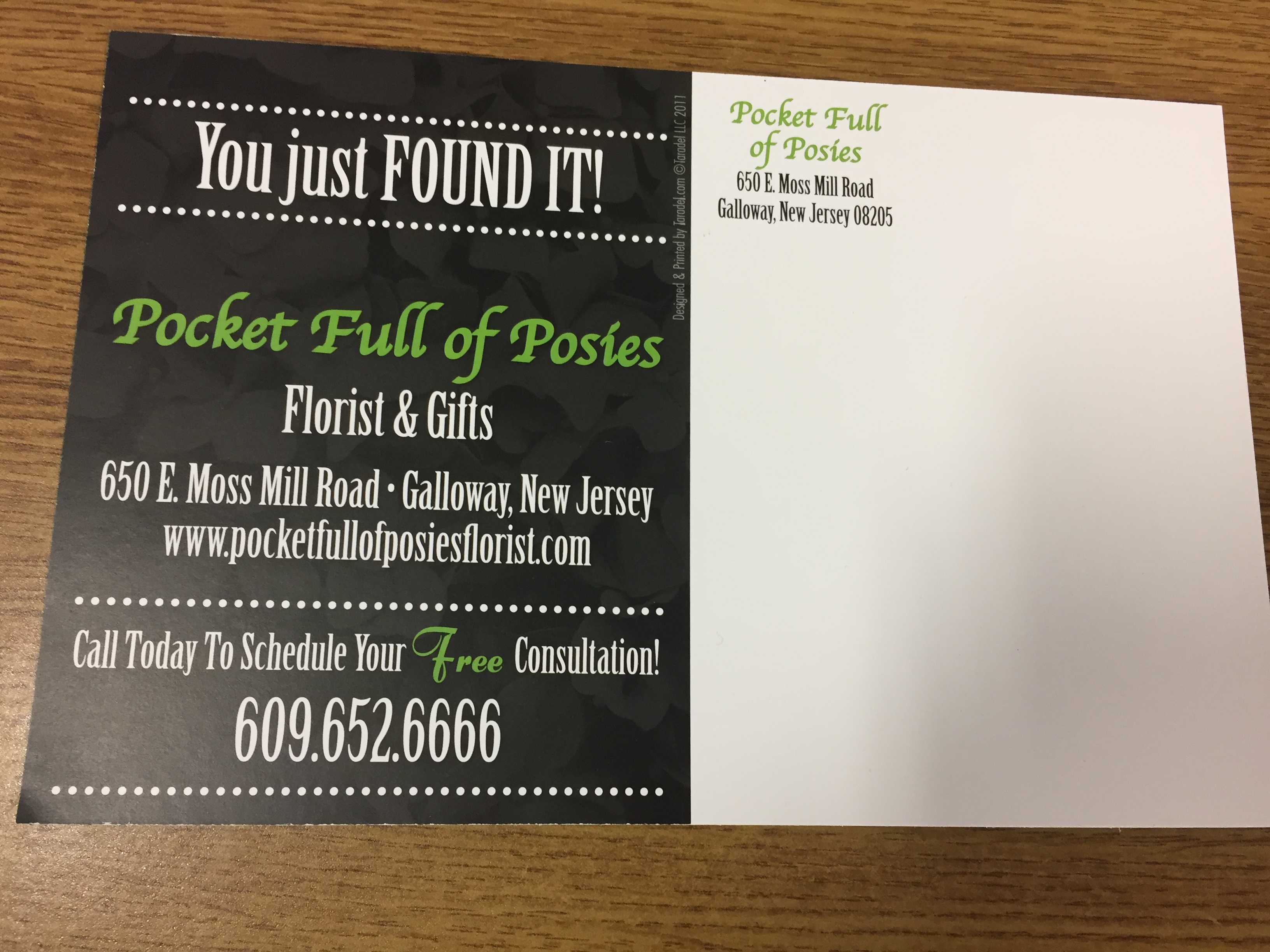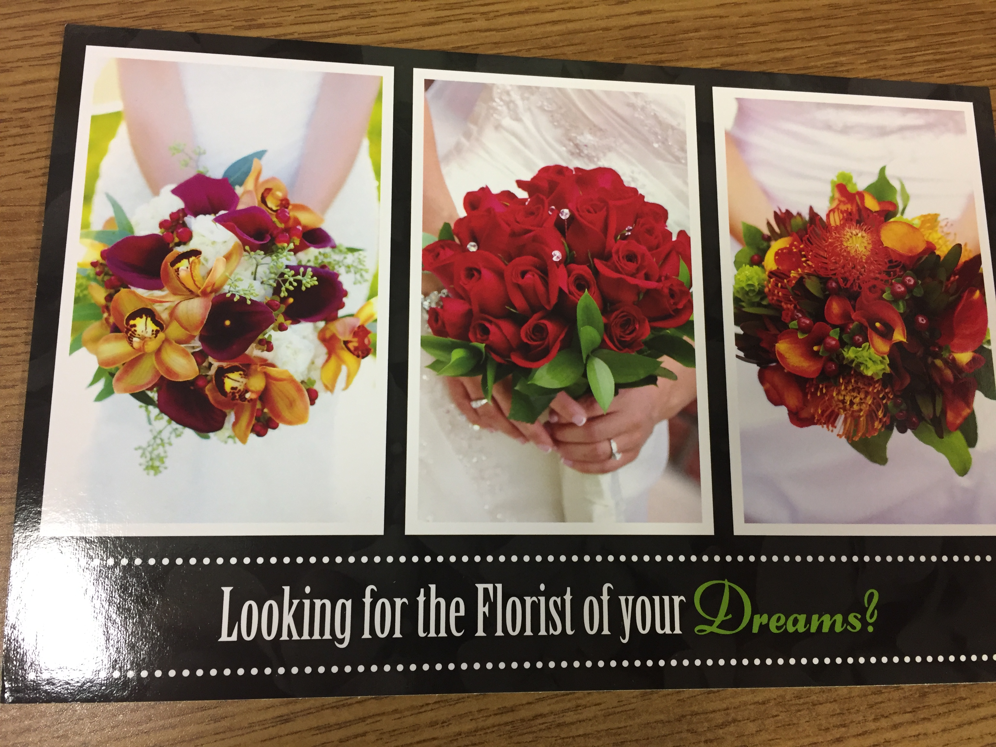 Looking from a new postcard to mail to new brides we meet at bridal shows to get them to call and book a consultation. Needs to be heavy on pictures to show our flawless work and light on text. Needs to make them want to call or email to book an appointment. 5 x 7 postcard. Current brochure attached and old post card attached. Font of "Pocket Full of Posies" is our logo. I have 1000's of wedding pictures to use.