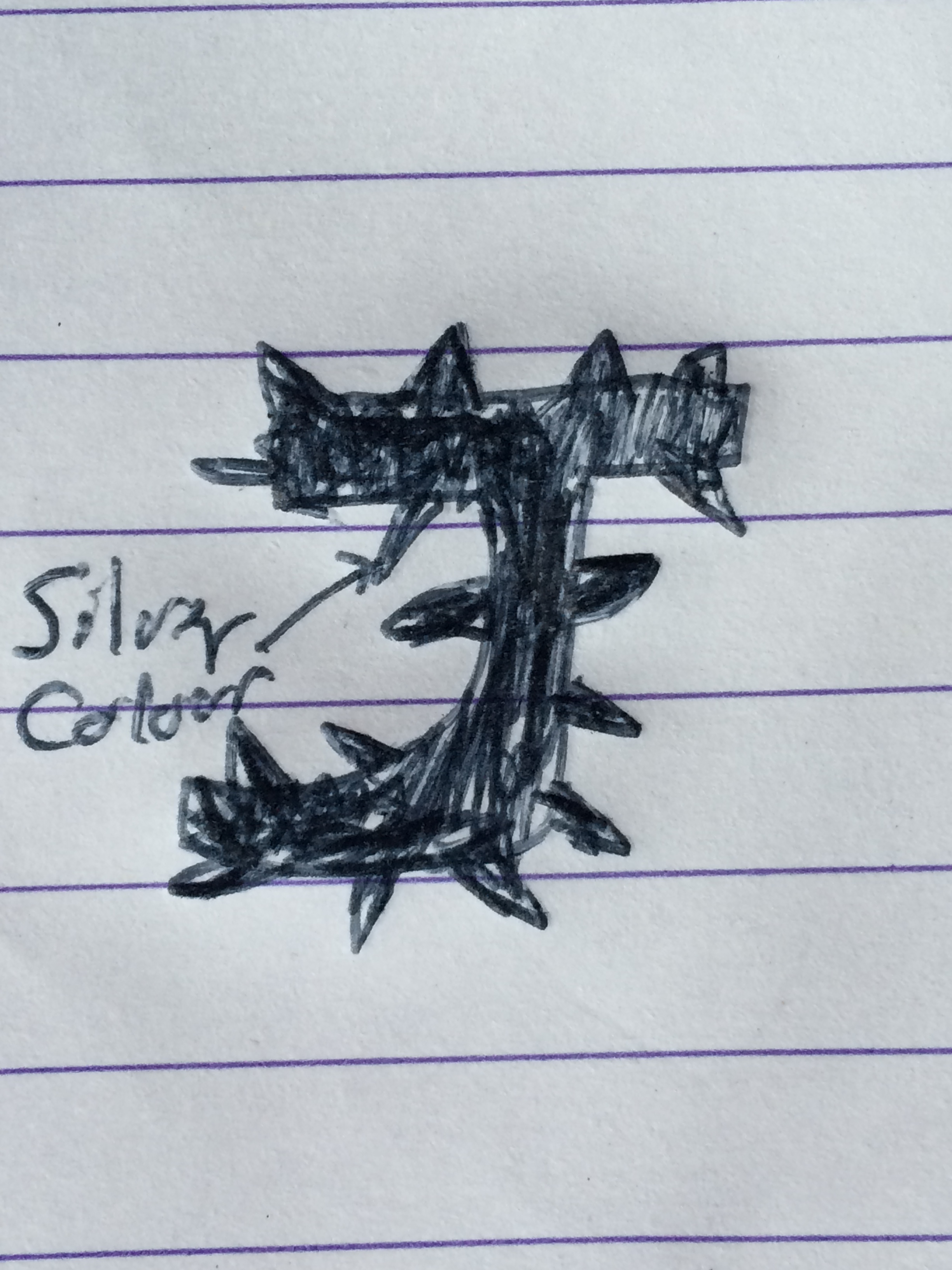 TEXT- “Jagged Steel” should be sliver metallic in colour (Steel) with little points/spikes coming out of each letter (Jagged) image 1- the example is just the J but all the letters should be the same ( metallic silver colour though) . The words "Jagged Steel" to Arch over the top ( Jagged ) and underneath ( Steel ) the symbol- like the image 2 attached.