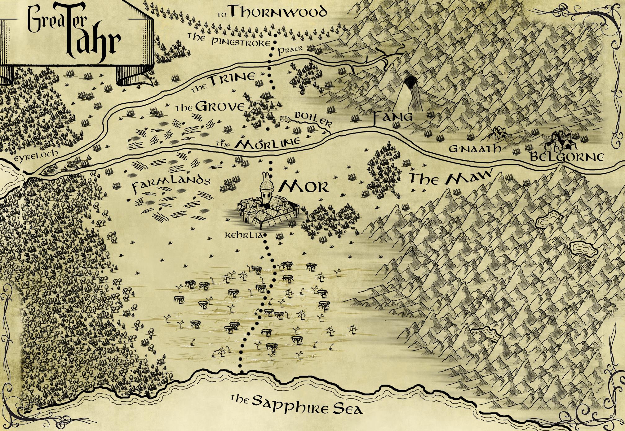 Attached below are a few images for inspiration, indicating the kind of lighting and "feel" I am going for, as well as a map to give you the lay of the land. (These are not from this series but just great images I could imagine seeing somewhere in the world of Tahr.)