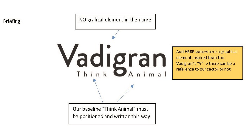 In our logo must appear our name "Vadigran" with a capital V and our baseline "Think Animal" (with capital T and A). -> please have a look at the attachment to see how we want our baseline to be positioned in our logo.