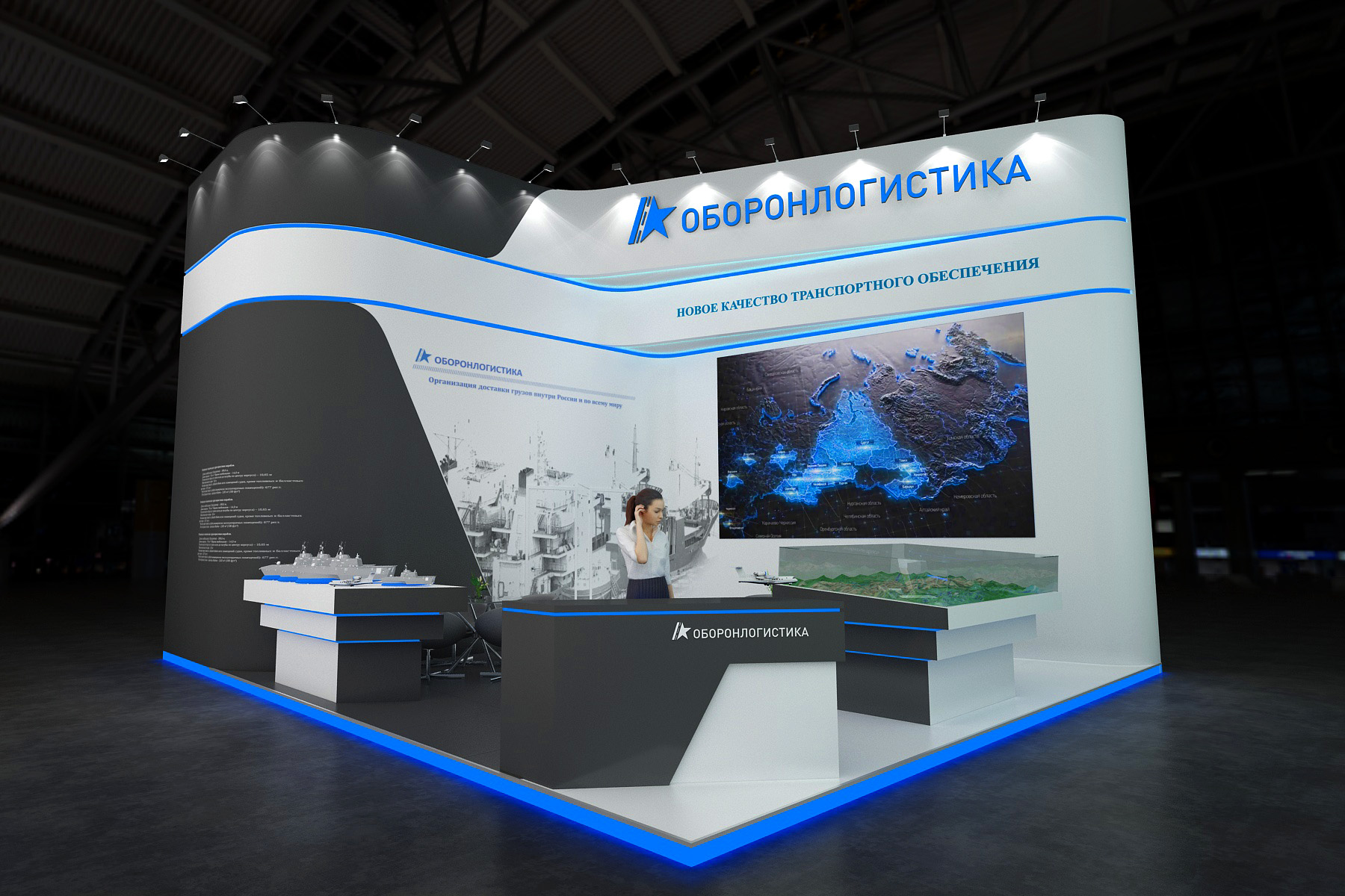 We need a proposal with stand design for leading russian company that operates in the field of cargo transportation and rapidly evolving on this market - OBORONLOGISTIKA LLC. OBORONLOGISTIKA LLC is one of the biggest transport and logistic operators in Russia having wide network of partnership companies and organizations to present a large scope of logistic services to it\'s clients: