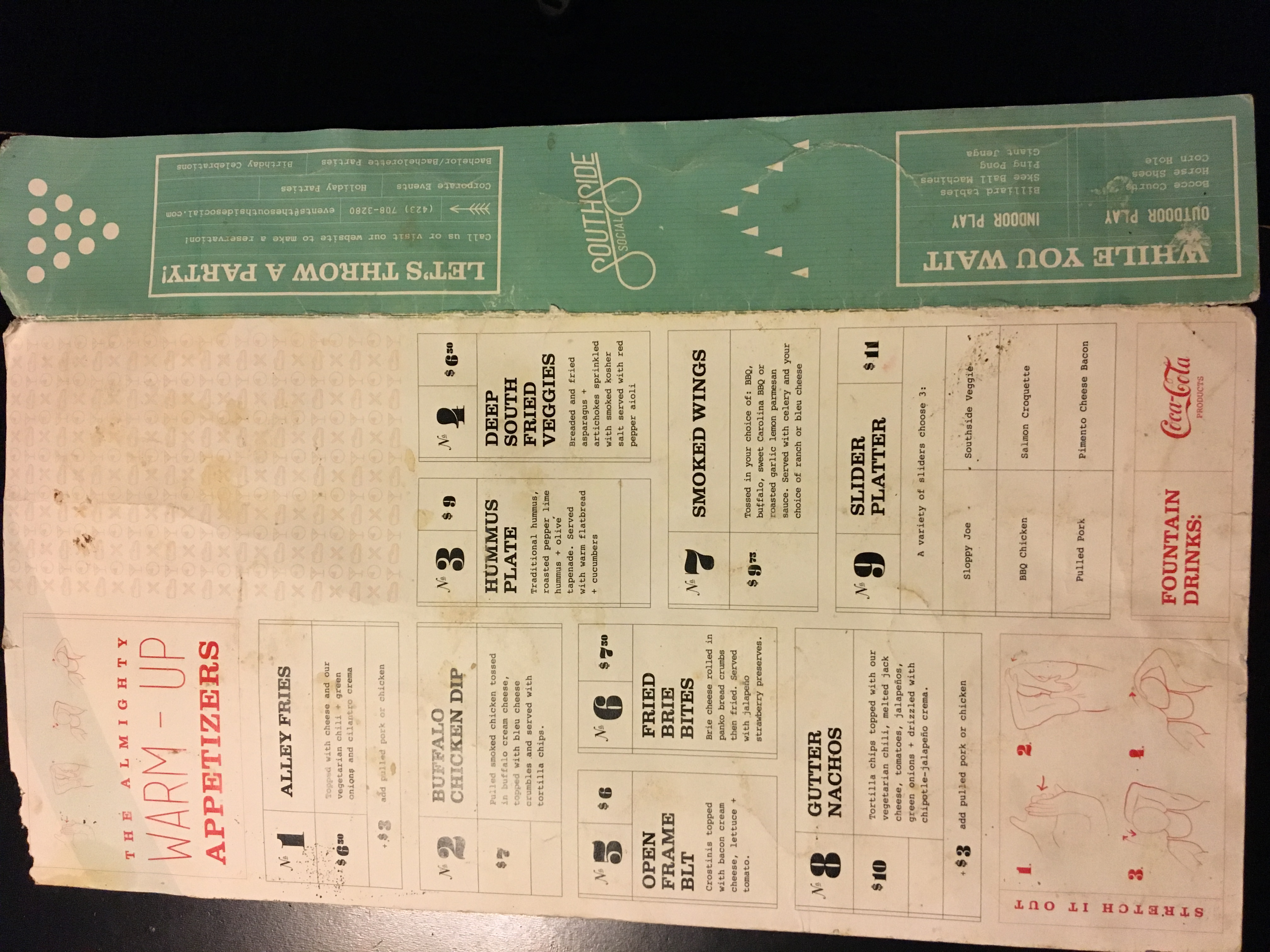 We need a menu that is visually captivating but not difficult to read. Southside Social is an activity based bar located in Chattanooga TN. We have 10 bowling lanes, corn hole, ping pong, shuffleboard, billiards, darts, skee ball machines, pin ball, ring toss, and giant jenga. We have a huge venue that seats over 350 guests and is one of the largest in Chattanooga TN. Our original menu creation was professionally done but due to management conflicts we lost the ability to continue using it. Since then, we've been stuck printing menus on word and it's embarrassing.