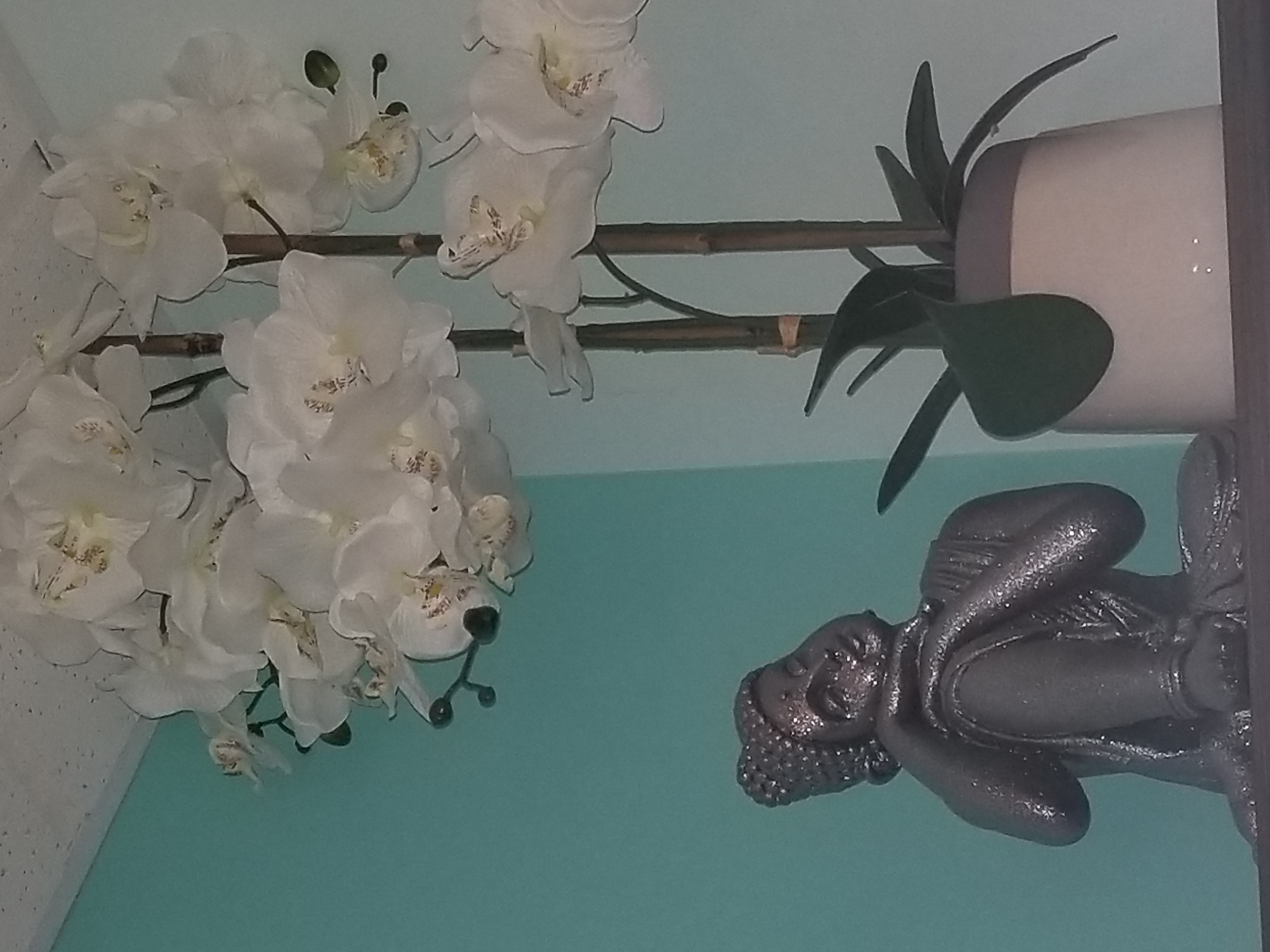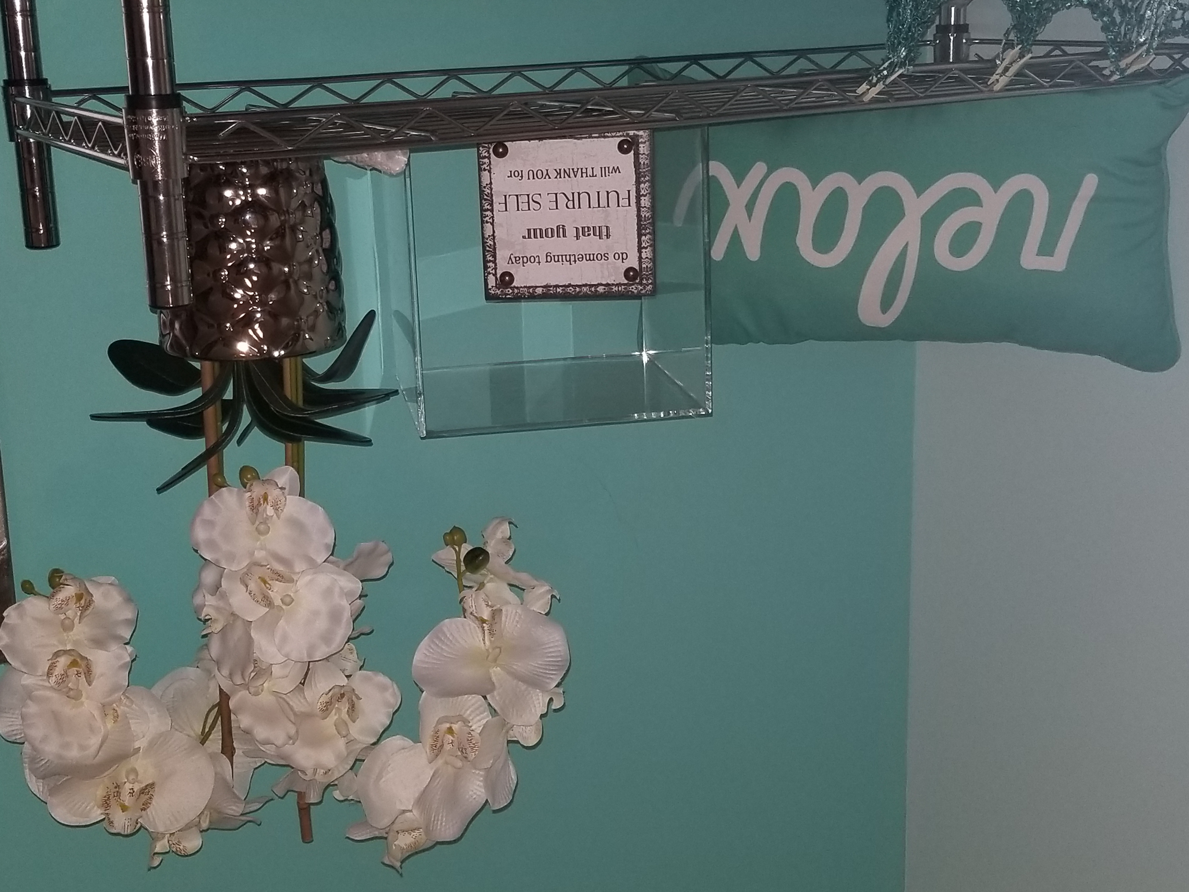 - The design esthetic in the shop is relaxing, zen, green/blues, silver accents, woman silhouette