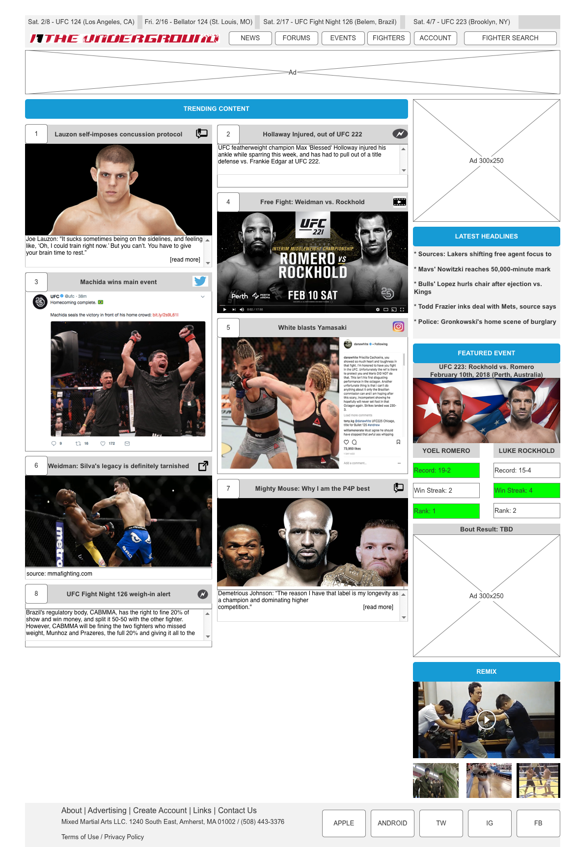 The layout is fairly simple with a new header, footer, and two column layout. The header features a top slim nav with event names, our logo, main navigation and a fighter search field. The right column features several content widgets and the left column (or main content area) features two columns of dynamically sized content boxes. Those boxes will feature seven different types of content and the containing box should be designed to clearly indicate the type of content (Editorial Blog, External Link, Embedded Video, Quick News Text, FB Post, Instagram Post, Twitter Post). These content boxes will also be numbered sequentially.