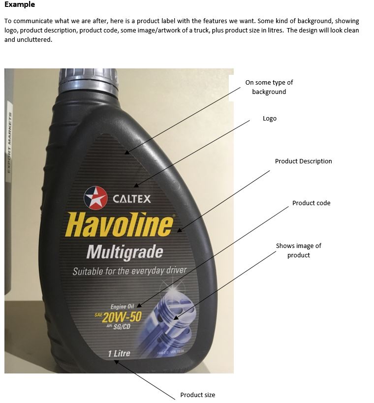 Attached is an sample label with the features we want (ie product description, product size, and so on). Please DO NOT use or see this as a reference for your design or style we are after. We do not want your creativity to be restricted by this sample.