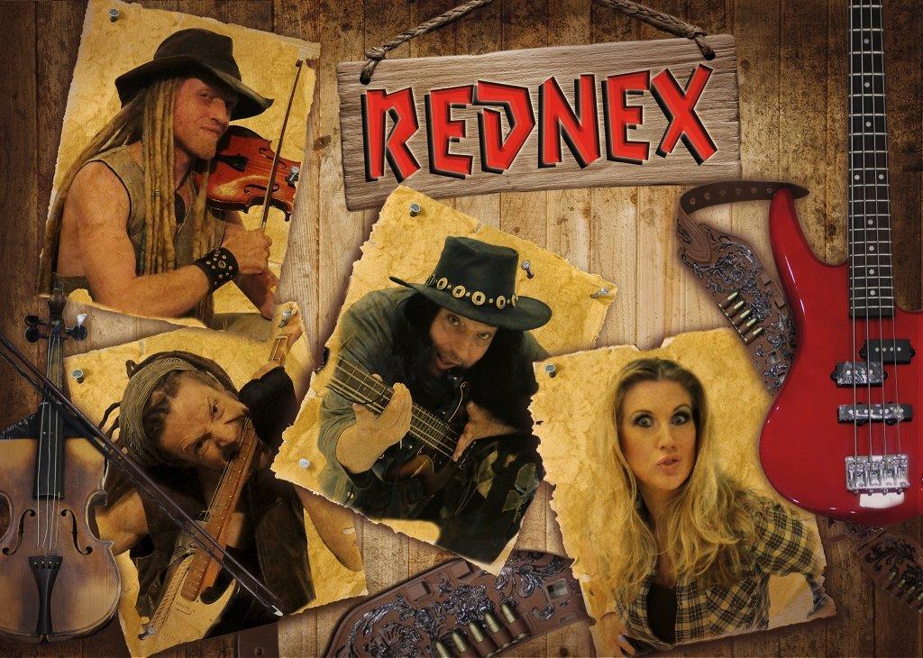 Rednex is a party band. It is good if the poster gives a feeling of party and energy, but it might also be better with a simple presentation of the performers without any frills. Watch these You Tube music videos to get a feeling for the band, which is pulling inspirations from rednecks and the Wild West (hay, farms, guns etc.)