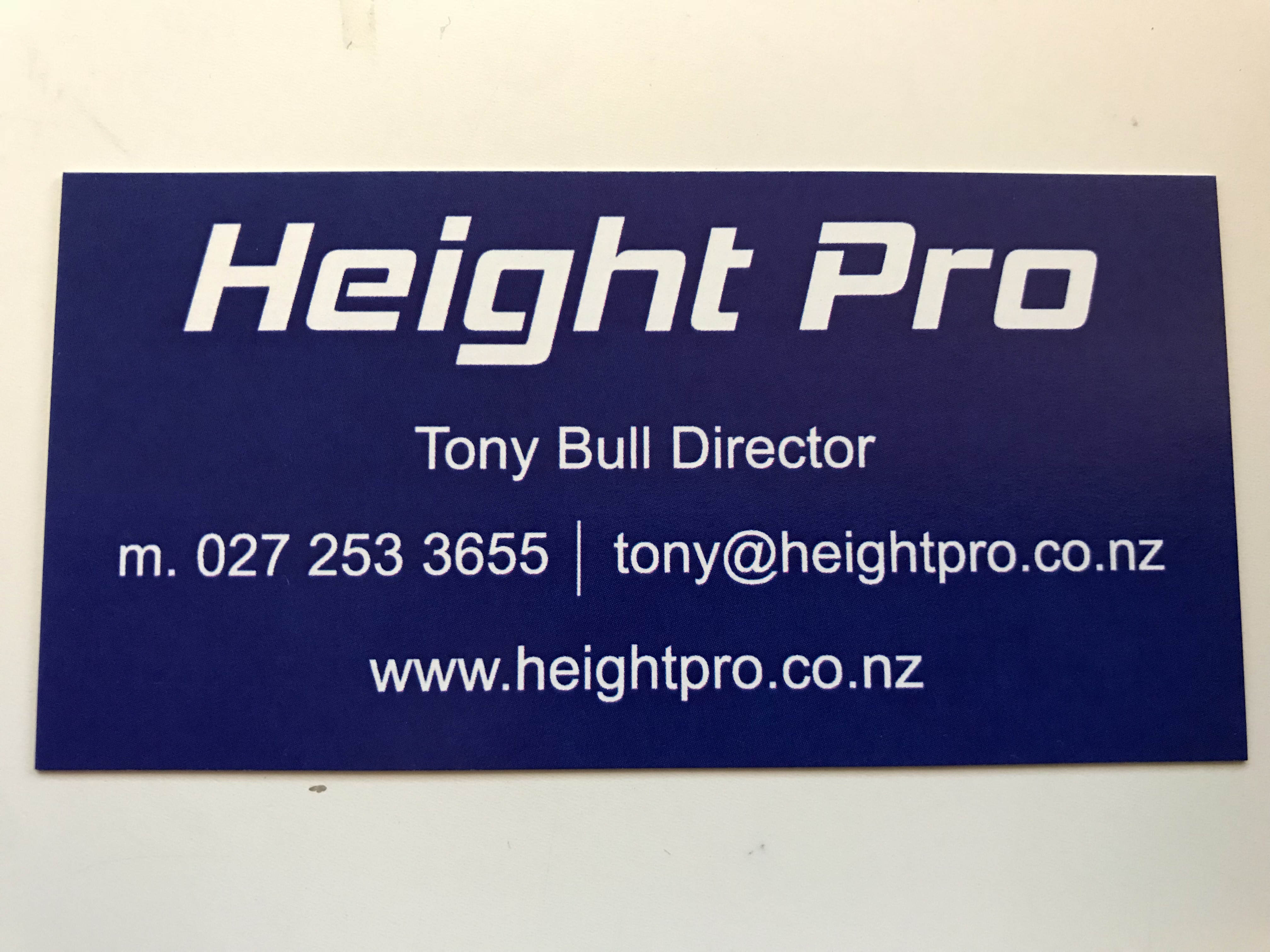 His mobile number is 027 253 3655 and email is tony@heightpro.co.nz. Website address is www.heightpro.co.nz.