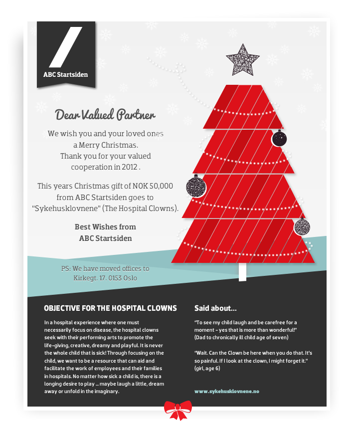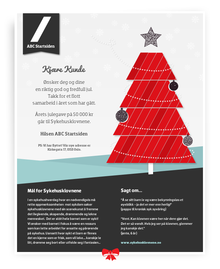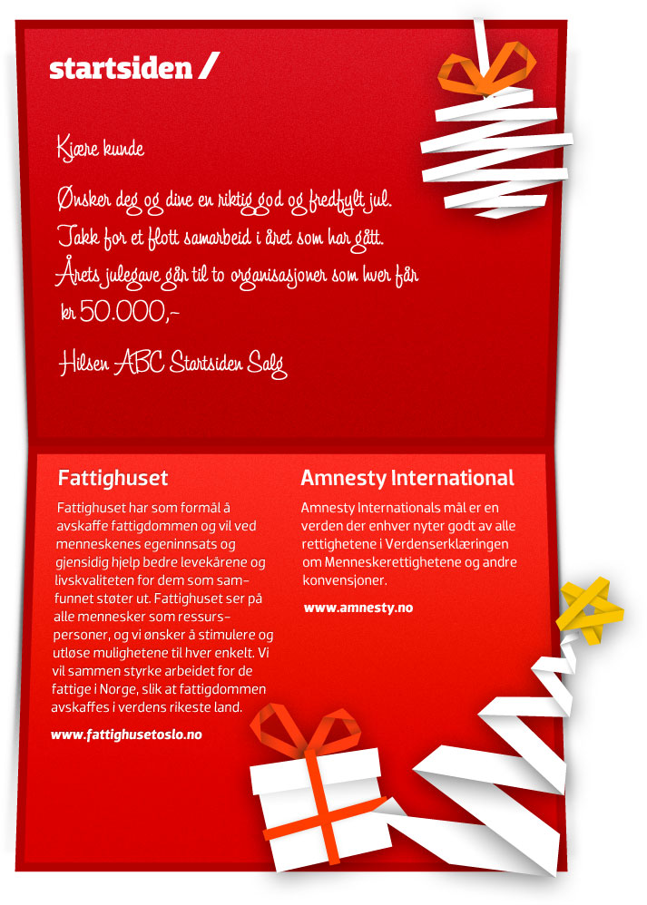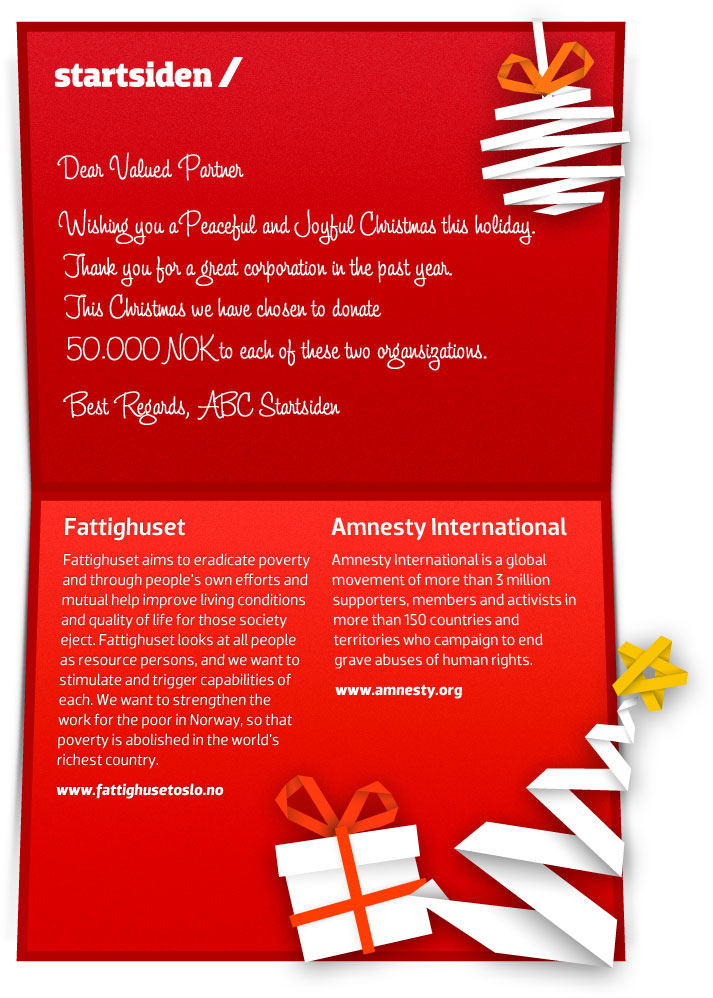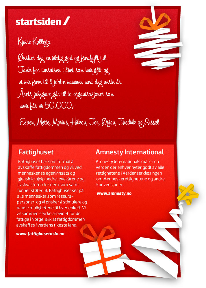 Realtively free in terms of design, but use previous Christmas Cards from pasts years as inspiration in addition to the colours in our company web which you will find at www.startsiden.no/om.