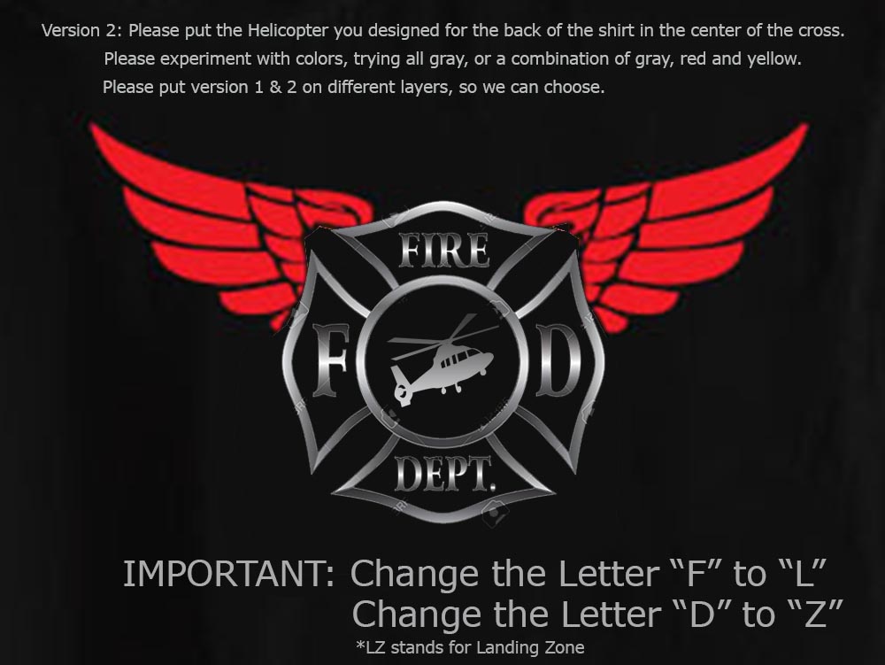 The Front design goes on the left breast area of the shirt and should be the Firefighter emblem with wings extending on each side of the emblem. Or something very similar. Please see our EMS flight crew wings photo attached.