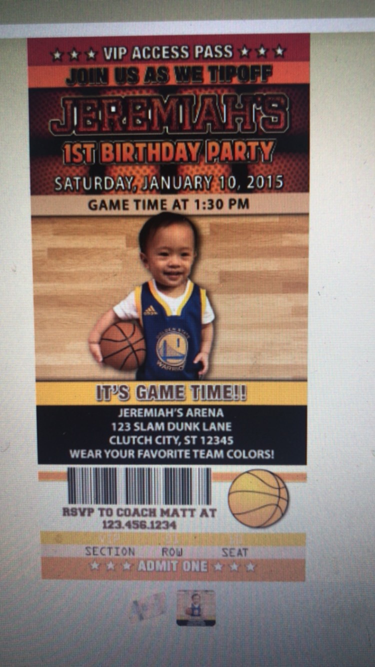 My wife and I need an Invite that looks like a Basketball Game Ticket. I will upload some examples which are our inspiration. Would like Eli Photoshopped on Steph Curry on Golden State Game Ticket. Maybe use the "The Finals" Ticket that I uploaded as the Template. Replace with "The First Birthday" Alternative Design is the same concept with a Saints Ticket. Big saints fans! May even purchase both designs if given the chance. Party Date - 7/1/18 Location - Summerlake Clubhouse Winter Garden, FL (8067 Pond Apple Dr, Winter Garden, FL 34787)