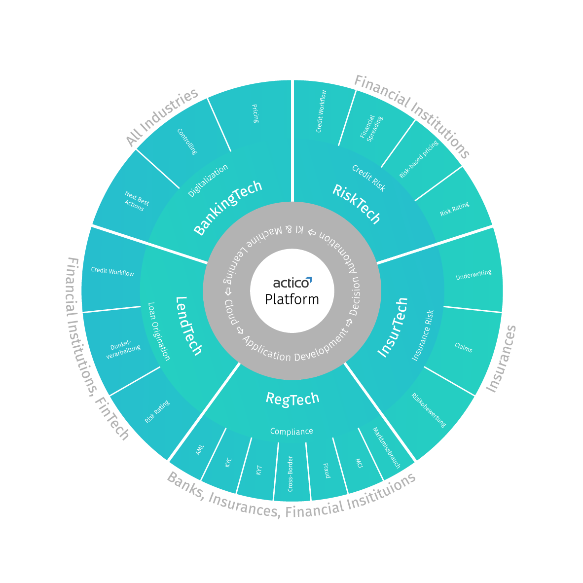 Acknowledgments in the financial industry and insurances, ACTICO is searching for a key visual, which can convey our story in a credible and easy way on our website and presentations. The design we focus on is our product, ACTICO Platform, a platform for Decision and Rules Management. With a glance at the graphic, our customers should be aware of the application areas of our products. ACTICO Platform capabilities: • ApplicationDevelopment • DecisionAutomation • AI & MachineLearning • Cloud The following topics and solutions are developed and implemented based on the ACTICO Platform: • Credit Risk (Financial Spreading) , Credit Workflow & Origination, Risk-based pricing, Credit Risk Rating, Early Warning System, Stress Testing) • Digital Business Automation (Customer Next Best Actions, Multichannel Pricing, Controlling, Decision Management) • Loan Origination (Loan Approval & Decision, Risk Rating & Scoring, Credit Workflow & Origination, Risk-based pricing) • Compliance (Know Your Customer, Know Your Transactions, Fraud, Cross-Border, Management of Conflict Interests, Money Laundering) • Insurance Processes (Underwriting, Claims, Risk Rating ) We want to convince with consistency and good storytelling. Storytelling is very important for us and we are open minded for new ideas. The key visual wants to be the base for our future communication. It will become a big part of our website, brochures, whitepapers and presentations. The graphic should be made with our primary color blue and additional colors. Feel free to use transparencies but please avoid photography elements. For more information and get to know our products, please check out our homepage www.actico.com. But please be aware that our web design will change in a few months, as we would like to relaunch our corporate design. For which the new graphic wants to be a main part. English: As an international company with many well-known customers from the financial industry and insurance, ACTICO is looking for a key visual that can convey our story credibly and simply on our website and in presentations. The design we are looking for should focus on our core product ACTICO Platform, a platform for decision and rules management. With a glance at the graphic, our customers should be made aware of the application areas of our products. The graph is a kind of visual summary of the contents of the ACTICO Platform: • ApplicationDevelopment • Decision Automation • AI & MachineLearning • Cloud Based on the ACTICO platform, the following topics and solutions are developed and implemented: • Credit Risk (Financial Spreading, Credit Workflow & Origination, Risk-based Pricing, Credit Risk Rating, Early Warning System, Stress Test) • Digital Business Automation (Best Practices of the Client, Multichannel Pricing, Control-ling, Decision Management) • Loan Origination (Credit Approval and decision, risk assessment and evaluation, credit workflow and origination, risk-based pricing) • Compliance (Know Your Customer, Know Your Transactions, Fraud, Cross-Border, Money Laundering) • Insurance Processes (Underwriting, Claims, Risk Rating) We want convince with consistency and good storytelling. Storytelling is very important to us and we are open to new ideas. The key visual will be the basis for our future communication. It will become an important part of our website, brochures, whitepapers and presentations. The graphics should be designed with our primary color blue and the additional colors should serve a maximum of two of our secondary colors. Transparencies can be used, but no photographic elements should be used. Further information and our products can be found on our homepage www.actico.com. Please note, however, that our web design will change in a few months as we seek to redesign our corporate design. The new graphics will be an important element for this.