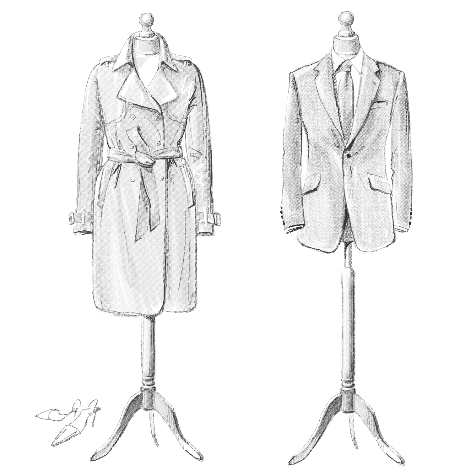 The idea is to have the mannequins in completed garments. The same garments that are on them now, but just a bit bolder, more completed. Instead of greyscale, a sketched colour would be perfect. For the lady mannequin a khaki colour like the traditional Burberry trench coats. For the male mannequin a navy suit colouring. Still sketch like.