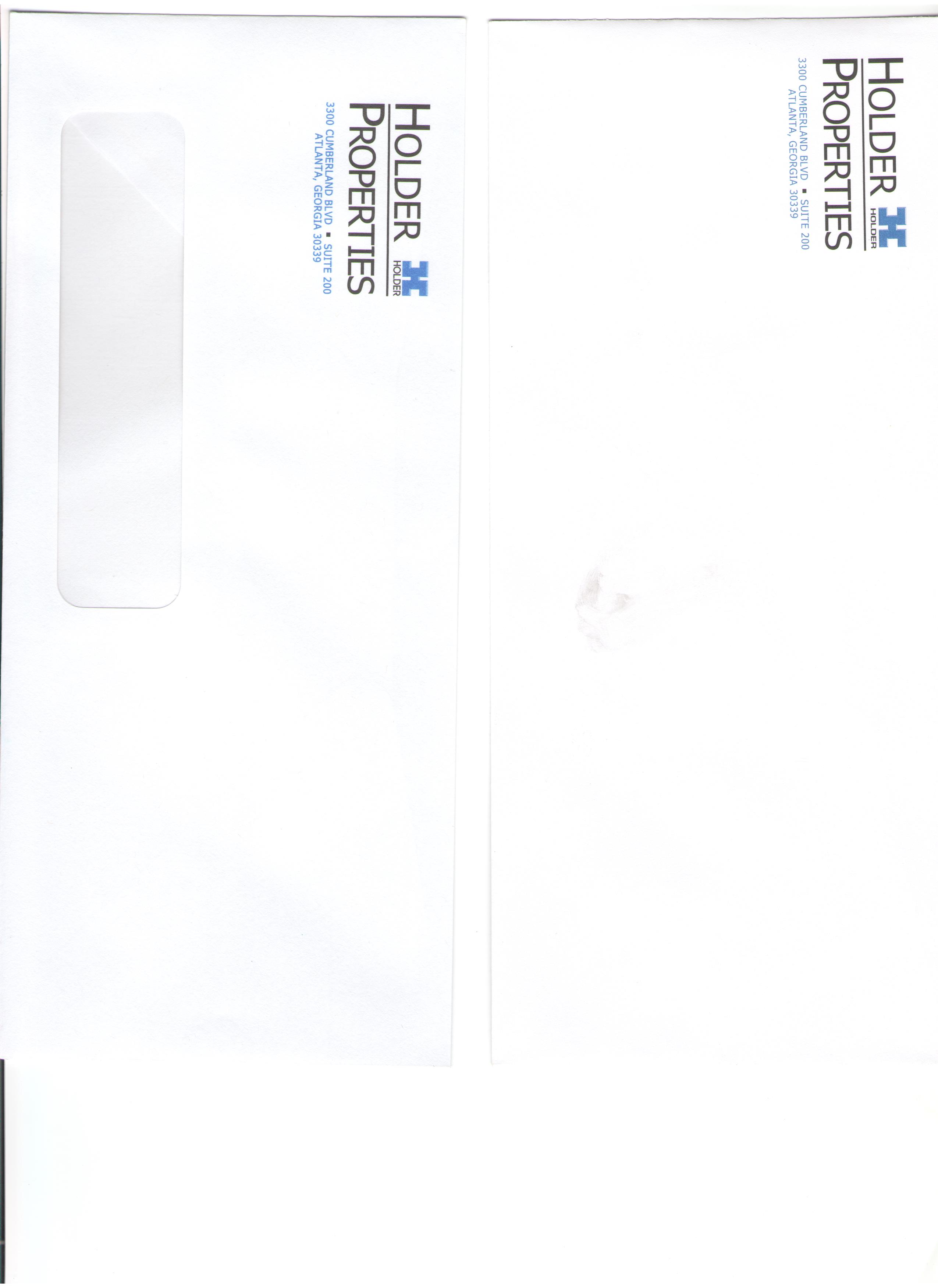 1. Business card - Leaning towards doing just a one side business card in a thicker paper. Include - logo, name - John R. Holder, Title - Chairman & CEO, 3300 Cumberland Blvd. Suite 200, Atlanta, GA 30339 - Cell number 404.451.####, Office 770.988.31## email@holderproperties.com; www.holderproperties.com.