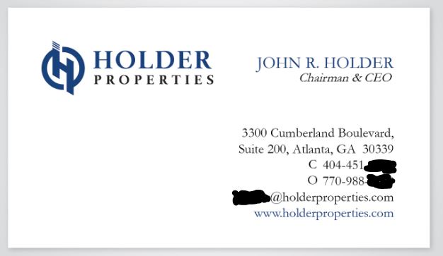 Include - logo, name - John R. Holder, Title - Chairman & CEO, 3300 Cumberland Blvd. Suite 200, Atlanta, GA 30339 - Cell number 404.451.####, Office 770.988.31## email@holderproperties.com; www.holderproperties.com.