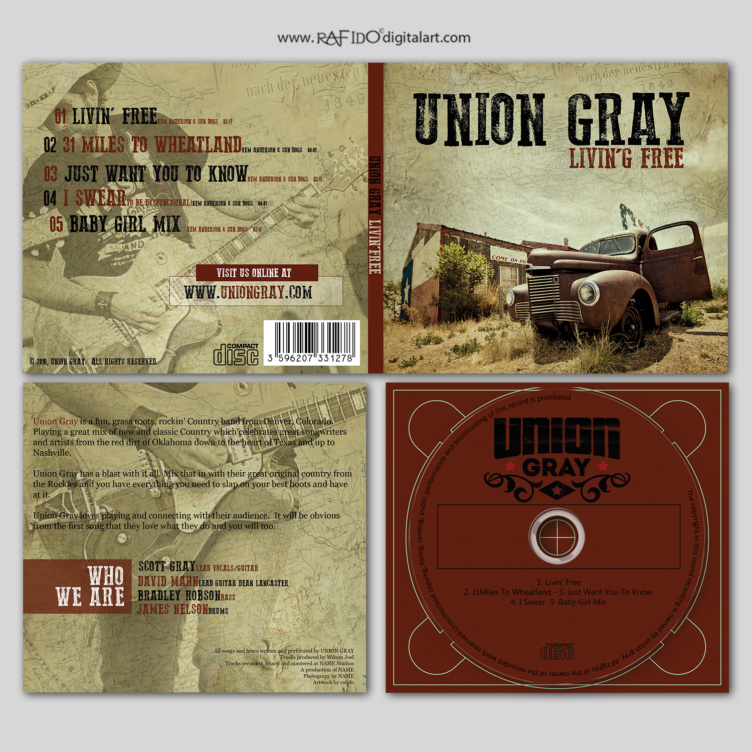 Our band name is Five Mile Sidewalk, with the Five spelled out. Name of the album is Me and Gasoline.