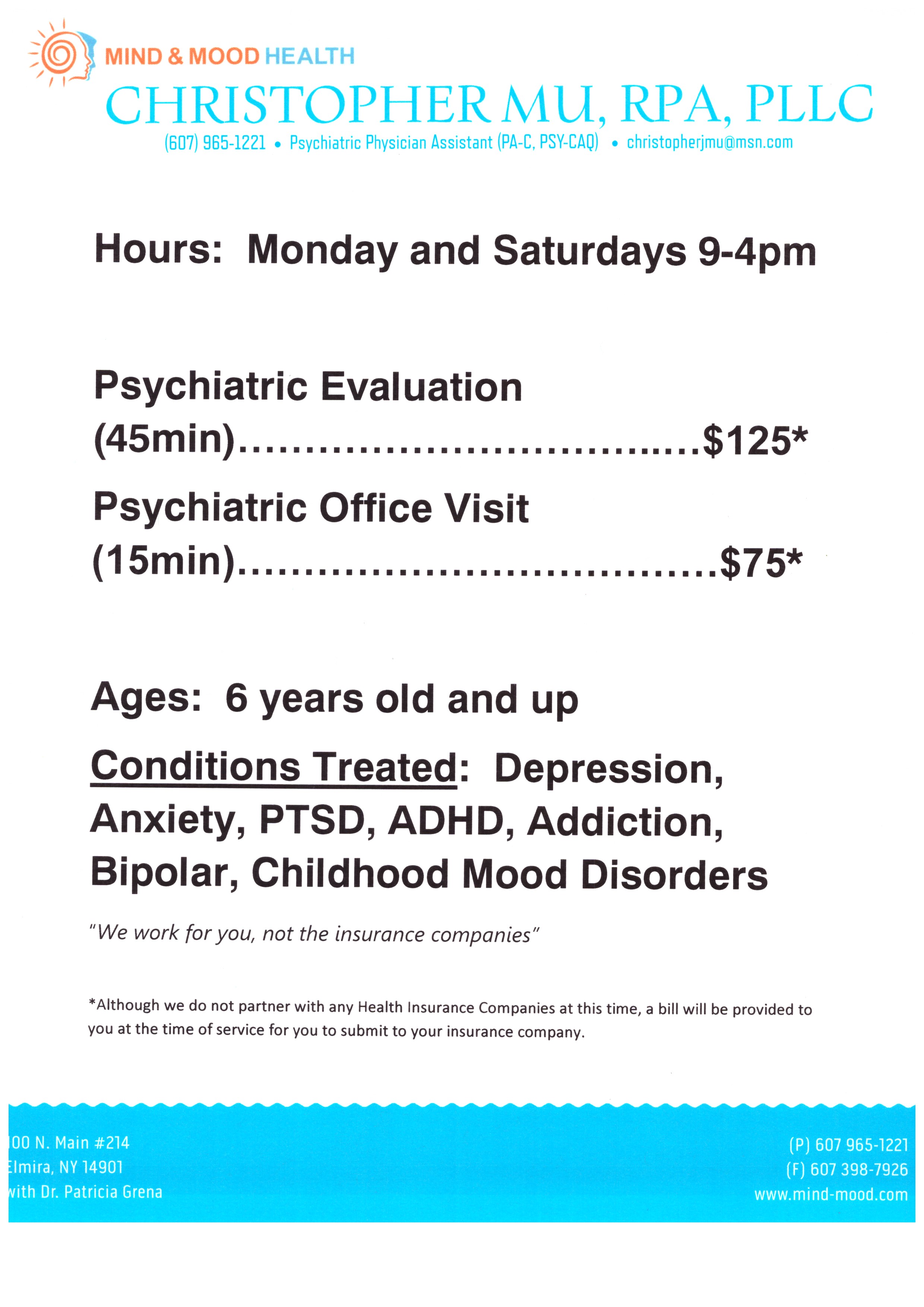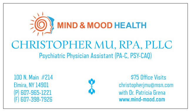 One page...clear enough to be read if faxed. This mental health clinic treats depression/anxiety in kids and adults. It also treats opiate and alcohol addiction. It's in downtown Elmira, NY and the owner of the clinic is from Elmira NY, where it's located. This clinic does not take health insurance, so it charges a low rate of $75 a visit once they pay the $125 starting fee.
