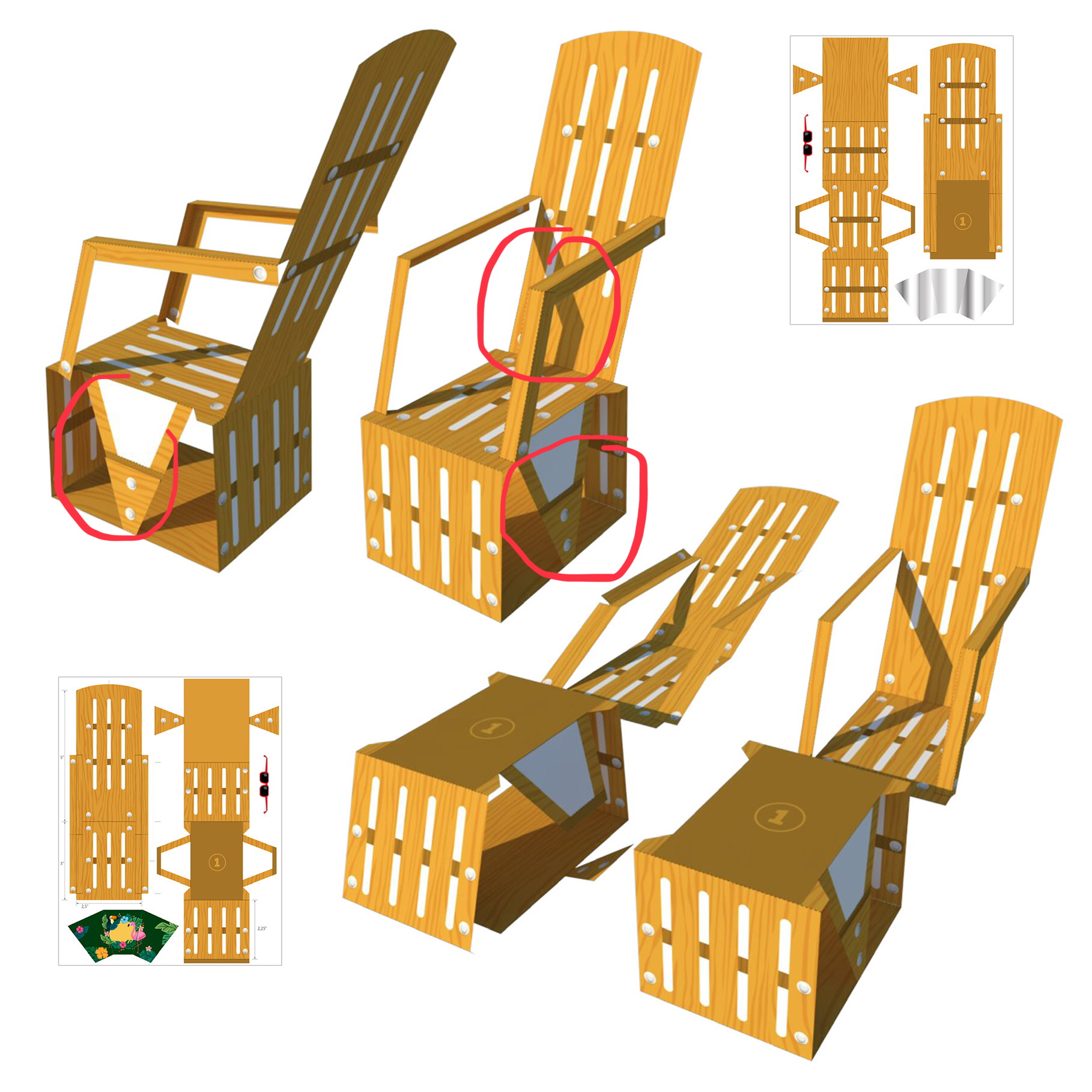 I am in need of a paper craft beach chair design that can can be folded into a 3D model with color printed on both sides. I have a sample photo of one attached. Once folded I would like the chair to be able to bear some weight. Use of limited adhesive or folding tabs is acceptable. On the same sheet I'll need sunglasses and a sun tanning reflector. The items would each be the following dimensions: