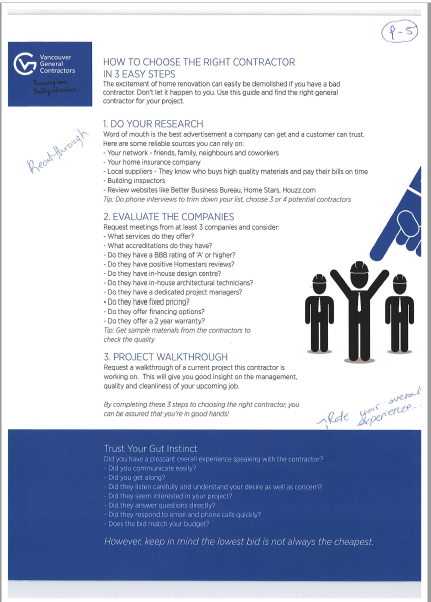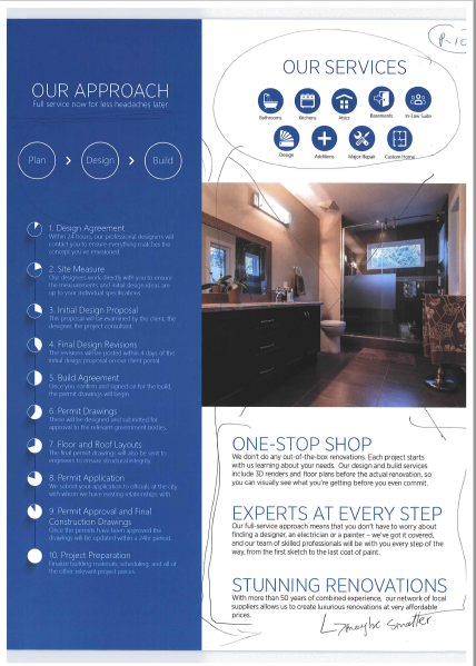 We are looking to update our current Print Material to reflect the current process we offer to our clients. A lot of the information is also outdated along with many of the photos that are currently being used. We are a renovation company that specializes in residential and commercial renovations and custom builds.This project is MULTIPLE pages. We will pay the chosen designer an extra fee for the designing 3-4 additional pages that are similar to the chosen design. Attached is our current Print Material. We are hoping to update the look of them and some of the messaging. Our current company colors are white, blue and light grey and it will remain that way.