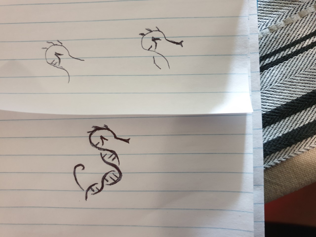 Small company called DNA Whisperer that provides genetic sequencing to businesses and clients. Anything from pet sequencing, human sequencing, testing and research. One idea is a seahorse made from the DNA double helix (dark and light blues preferred). I have added some pictures I like and some hand drawings of some of my own ideas. Open to innovation!