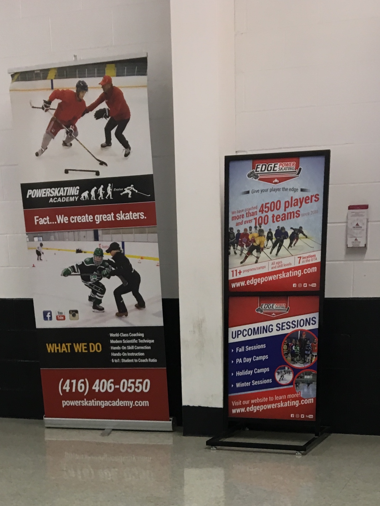 We need 1 large banner and 2 posters (on stands) created for inside Arena advertising. We want to use the attached Under Armour (UA) example as a guide for this design request. The theme is Speed. We want to see a mature hockey player skating very fast in a forward stride position. We want to see elements of speed from the hockey player and also from its surroundings like the UA example with the landscape blurred from the speed. Our logo is to be prominent in the poster. The message; Skate Fast. Be First (or 1st). THINK SPEED. website address & social media icons also to be included