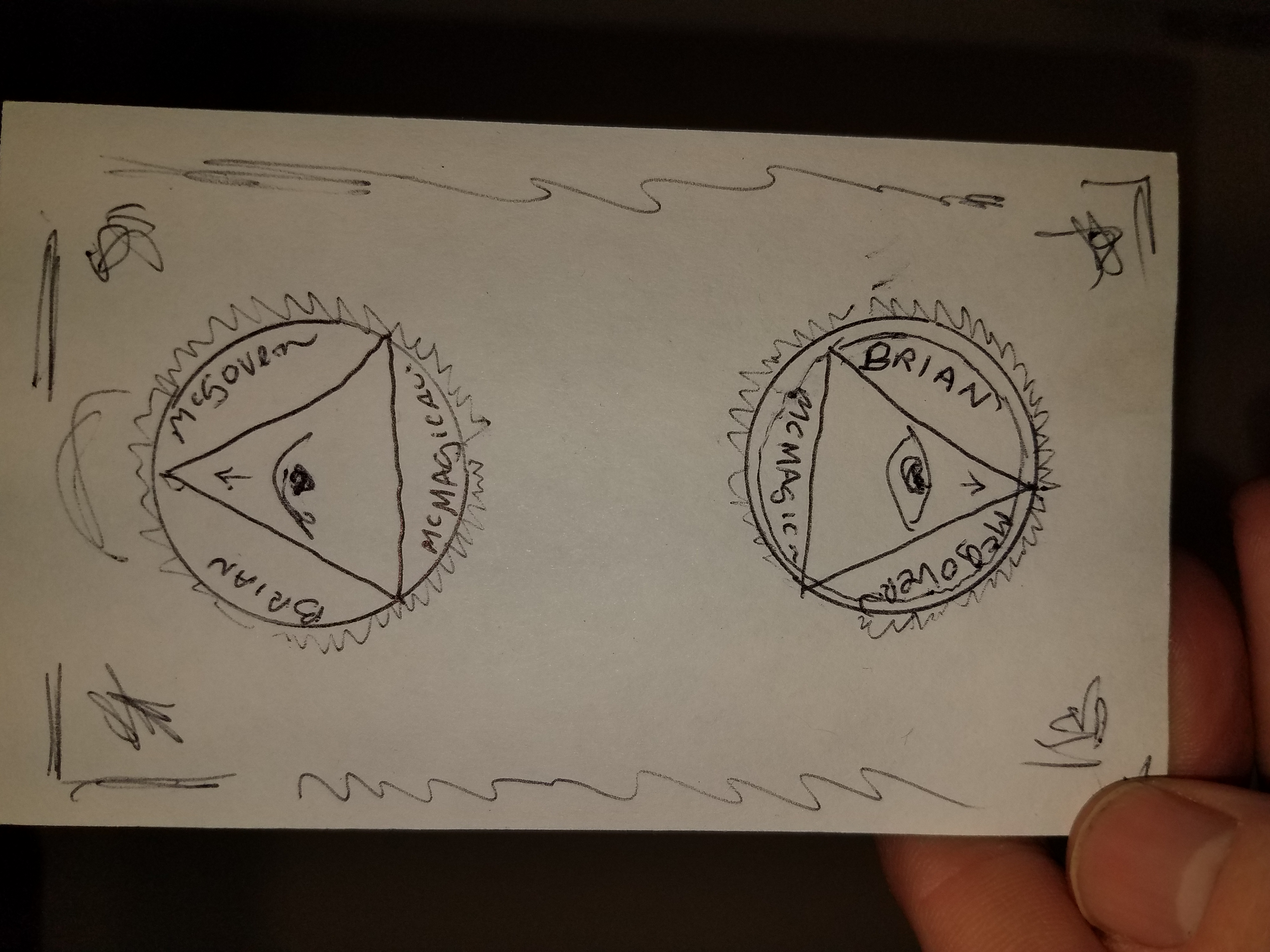 • Please see "All Seeing Eye" design attached. Remove the Latin phrase and replace with Brian (top left) McGovern (top right)