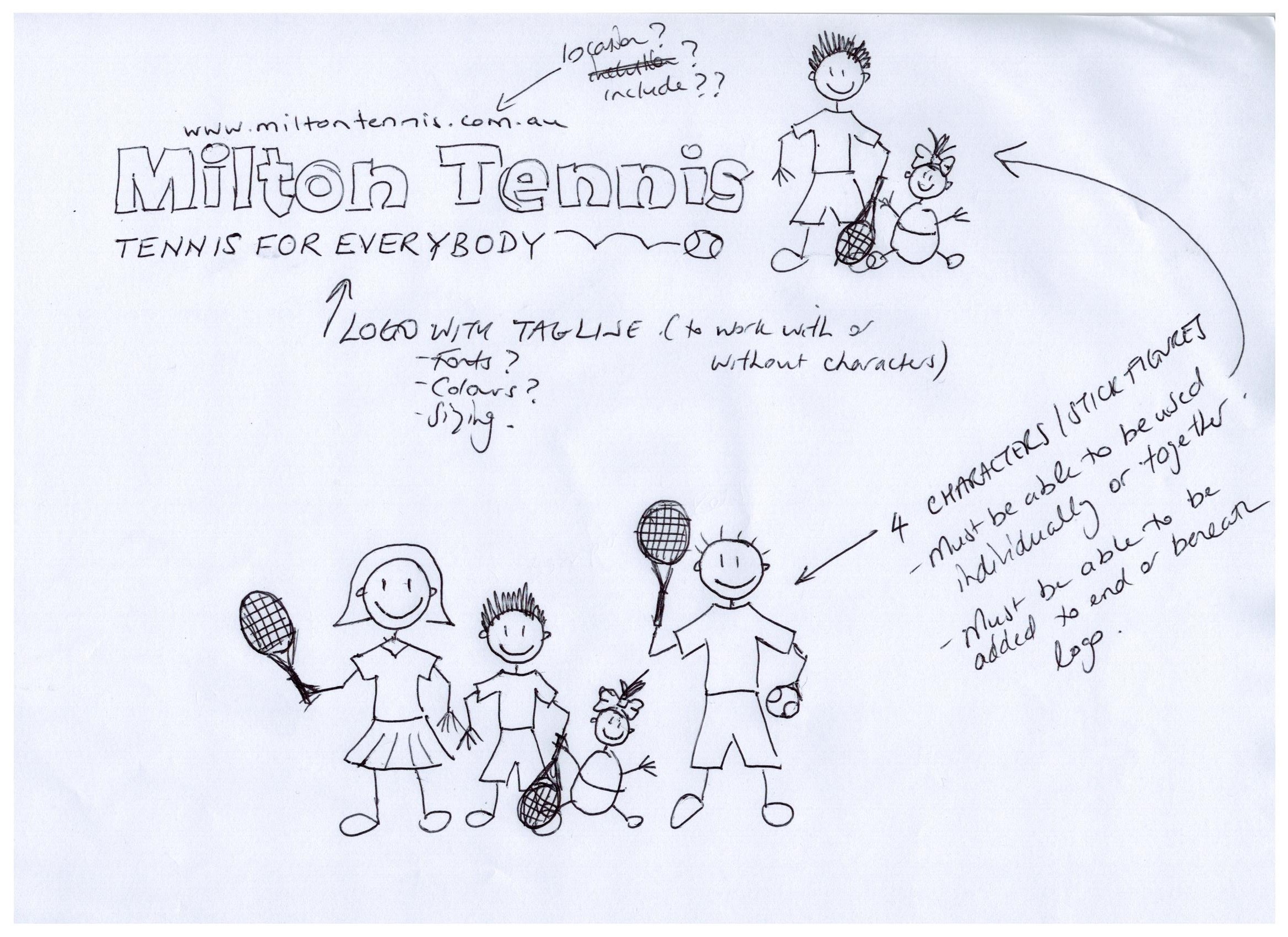 We need a logo design and "characters" for a community based tennis club. The club is called "MILTON TENNIS" and our tagline is "TENNIS FOR EVERYBODY". The design should target the family market and communicate our goals of fun and participation.