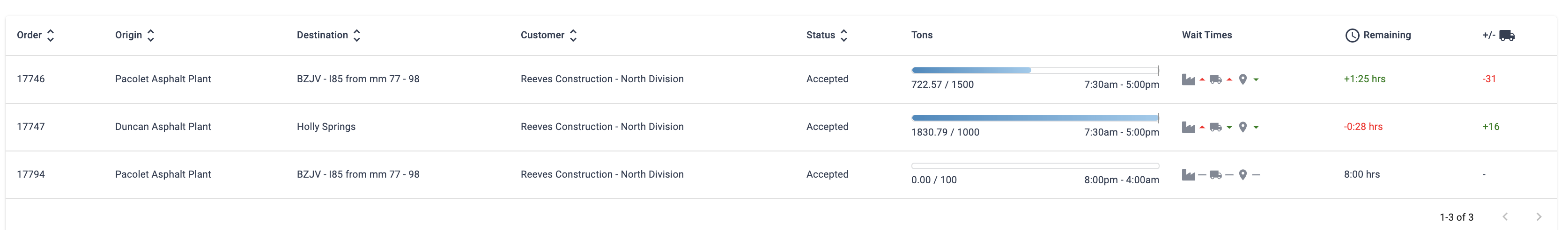 - The icons for plant, driving and jobsite show if the actual times have exceeded or beaten the planned times. Maybe you have other ideas to show the user if the trucks are sitting longer on the jobsite, at the plant to get loaded or driving to and from the jobsite.