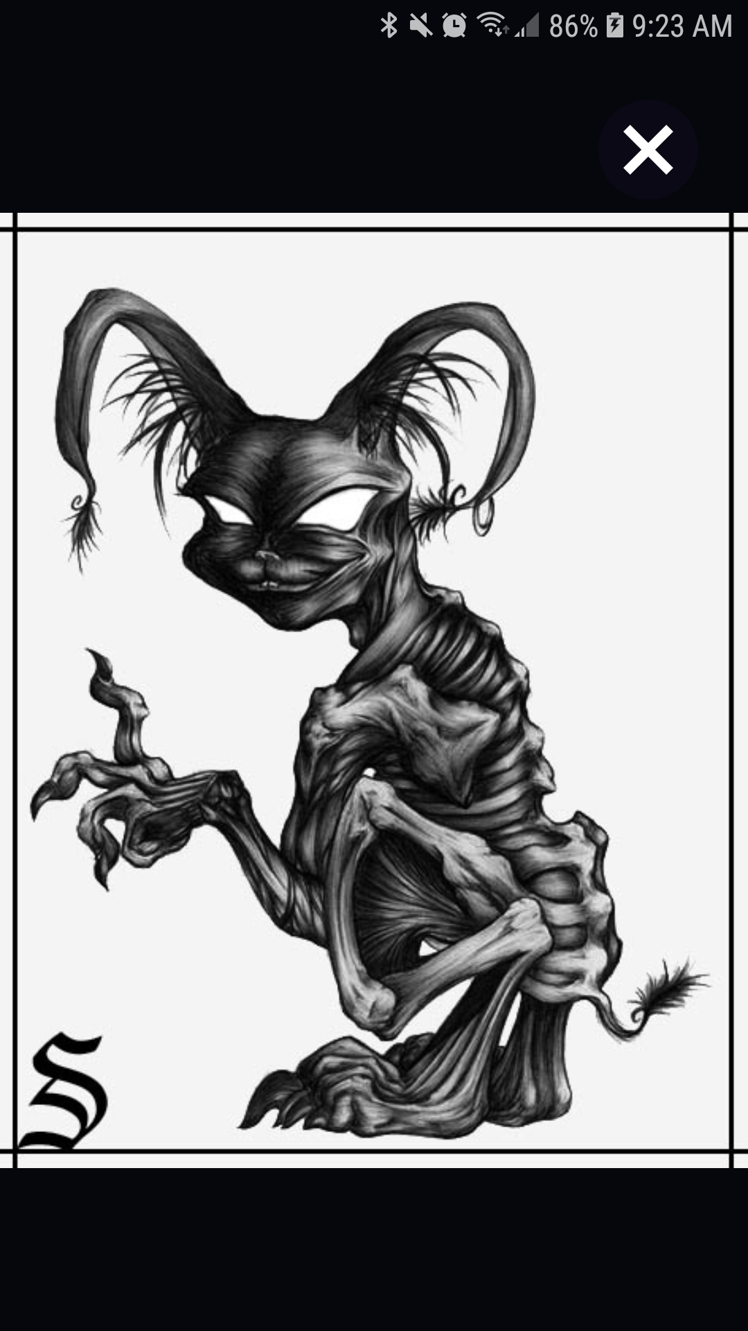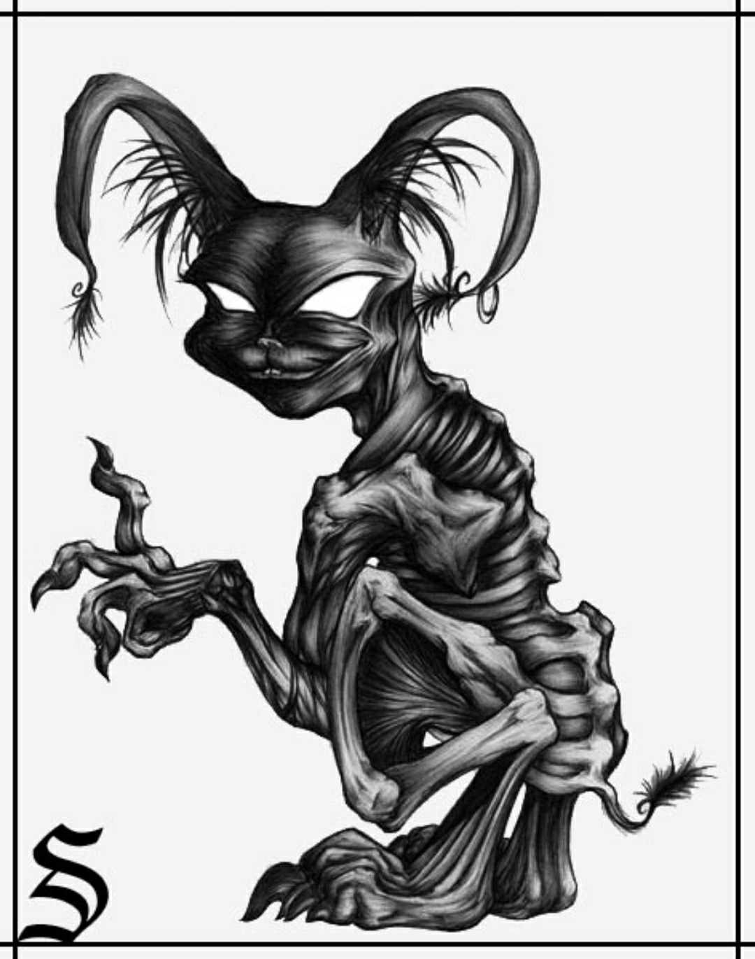 "It's an adaptation from the 'twisted' Chesire Cat in American Macgee's Alice video game. More zombified and no markings or jewelry. But creepy. With the smile, torn ears, white eyes, and razor claws.