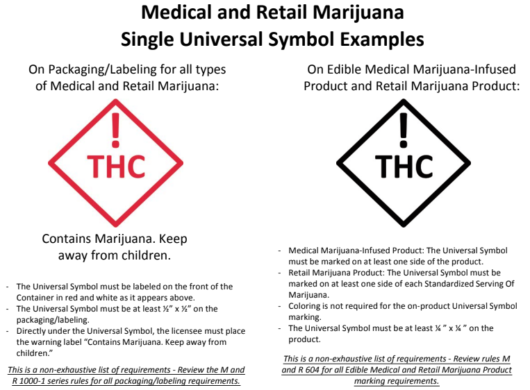 Needs red THC warning symbol & Contains Marijuana. Keep away from Children. Font for this warning needs to be at minimum 1/16" Red symbol must be 1/2" tall.