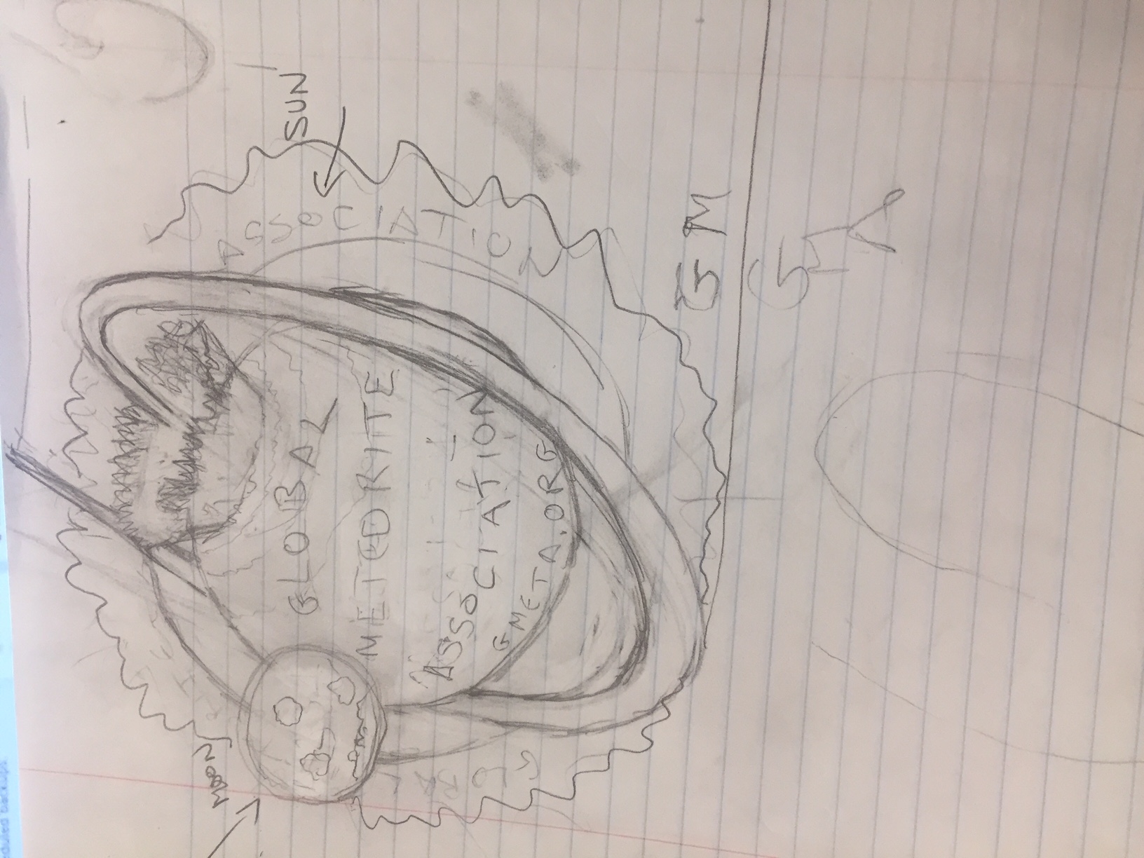 The "my-sketch.JPG" and "latest sketch of basic elements.psd" really show what I am looking for. I'd like for the orbit to look like a stylized "G". The "meteor-impact.JPG" provides a general idea of what an impact would look like. The "GMA Globe sketch V7.ai" shows how I want the orbit split into 2 sections.